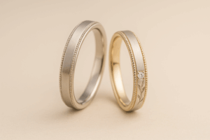 結婚指輪は、シンプルなデザインを基調としながら、さりげない個性を演出するディテールが特徴。素材の組み合わせやテクスチャーの工夫により、独自の表現を実現しています。