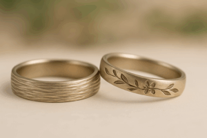 この加工は、指輪に独特の表情をもたらし、単調になりがちなシンプルなデザインに動きと柔らかさを加えます。また、指輪の表面に施される加工は、見た目の美しさだけでなく、触感にも影響を与え、着用するたびに心地よさを感じさせてくれます。日常的に身に着ける結婚指輪だからこそ、視覚的な魅力と触覚的な快適さの両方を考慮し、ウェーブのようなテクスチャーを取り入れることで、より愛着のわく一本になるでしょう。