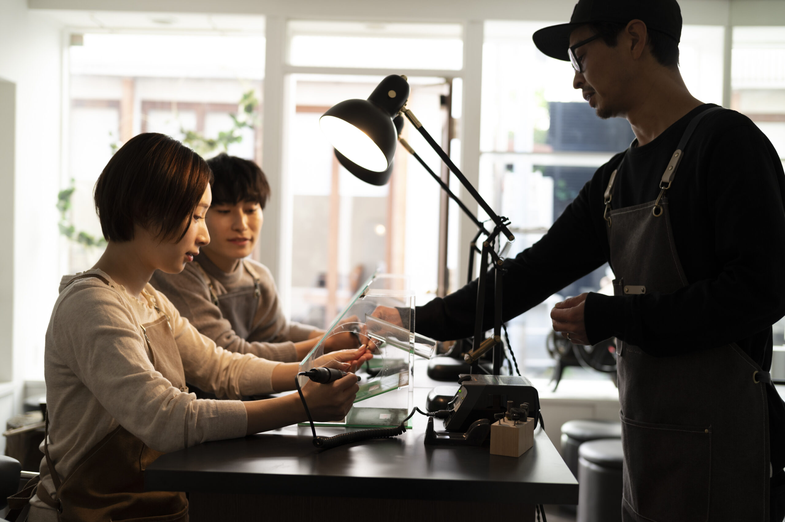 隠れ家的な工房では、プロのレクチャーを受けながらデザインから作成まで自分たちの手で指輪を作ることができます。