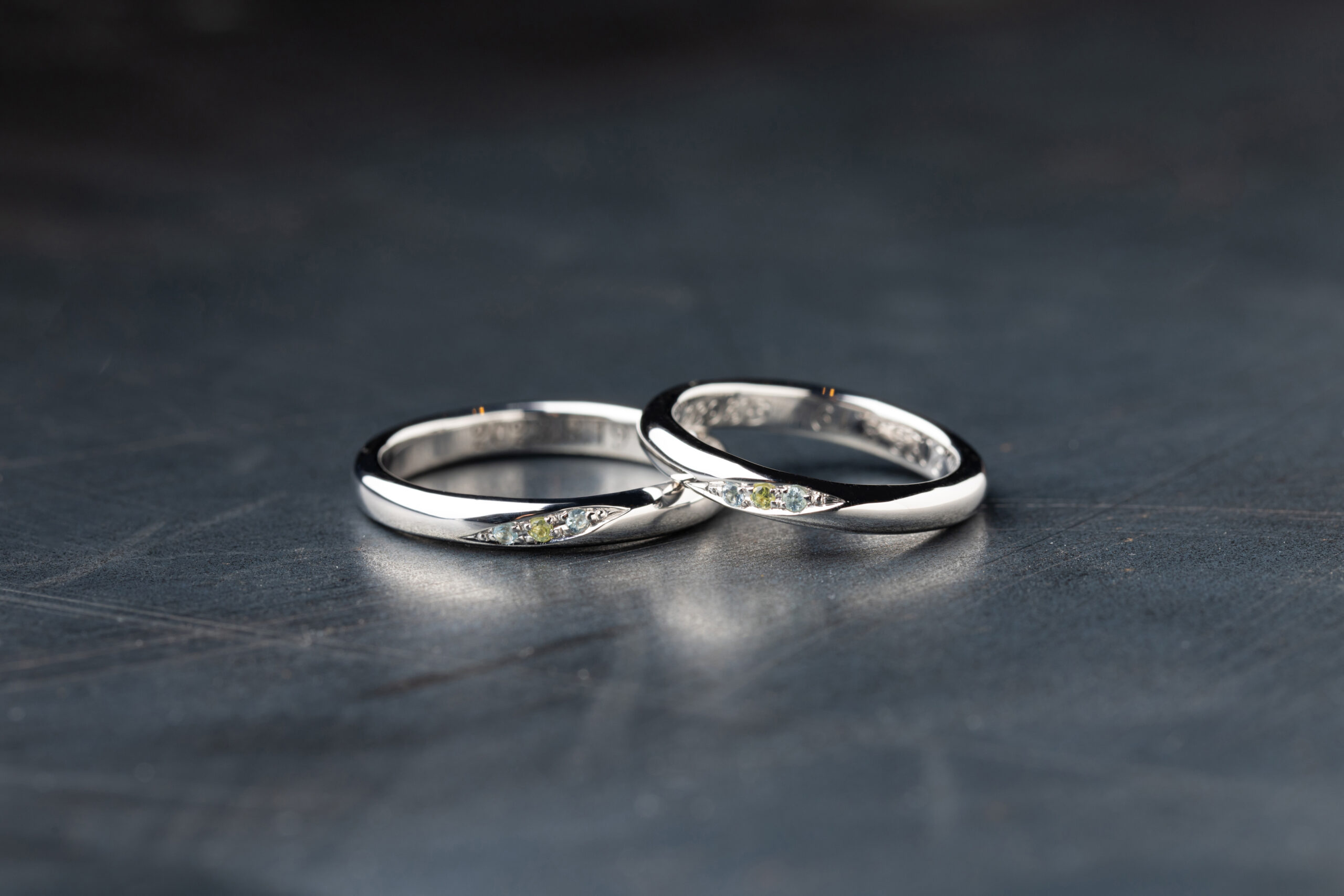 例えば、男性はスクエア型のリング、女性はカーブのあるリングを選ぶと、ペア感を残しながらも印象を変えられます。