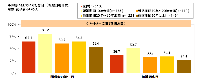 また婚姻期間別に見てみると、結婚10周年未満の夫婦の半数以上が結婚記念日をお祝いしていることがわかりました。