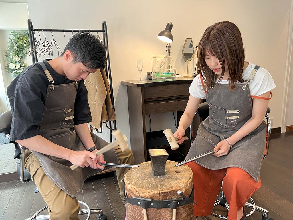 指輪作りは男性が1人で行うこともできますし、2人で協力して作ることも可能です。地金を叩いて形を整えたり、磨いたり、職人がマンツーマンでサポートするため、細かな作業が苦手な男性でも質の高い婚約指輪を作ることができます。