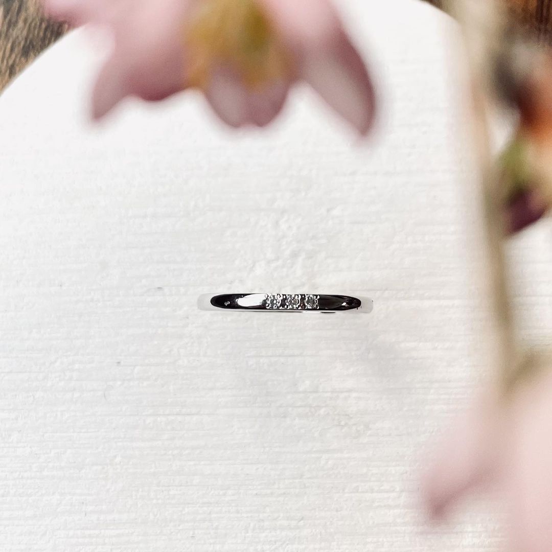 3つのダイヤを「彫り留め」で留めたデザインです。シンプルな留め方ながら、石の美しさが際立ちます。2~3つ連ねると印象的な結婚指輪になるでしょう。