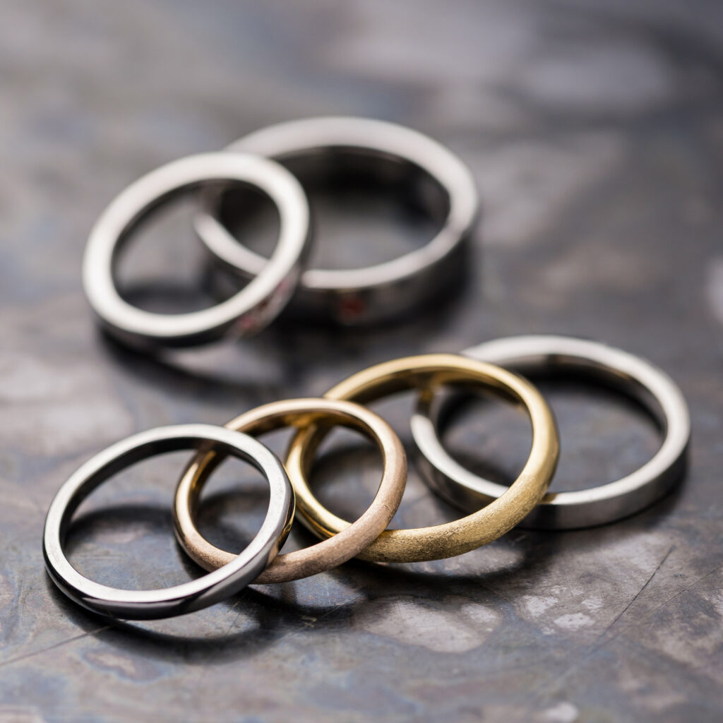 ゴールドの指輪はカラーバリエーションが豊富です。割金(合金にする際に混ぜる金属)によってさまざまなカラーを生み出すことができます。
