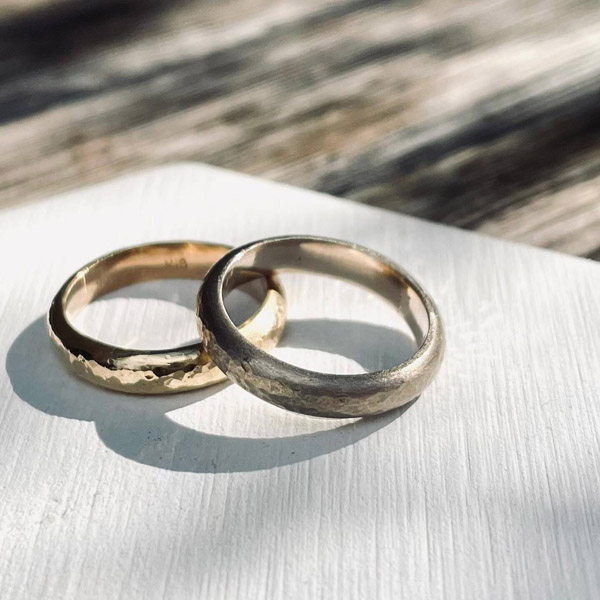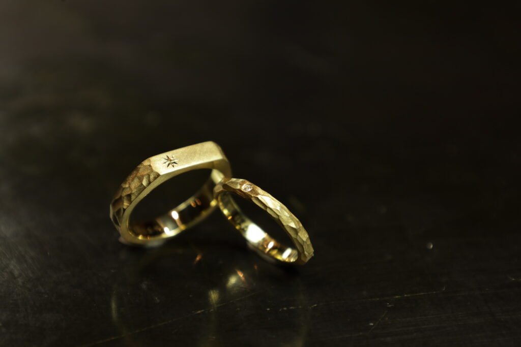 リング表面にハンマー仕上げを入れたゴールドの結婚指輪です。