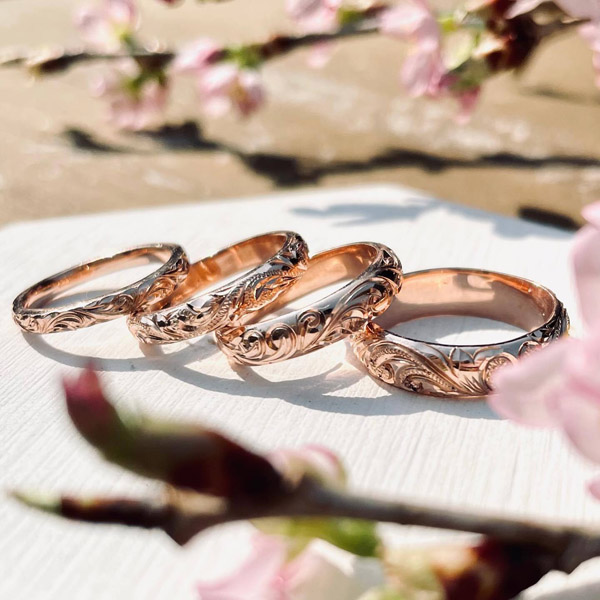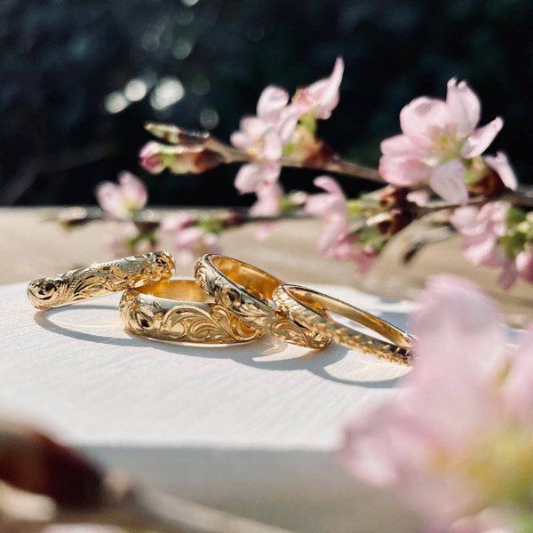 ハワイアンリングは繊細で美しい彫り模様が魅力です。イエローゴールドの温かみのある色合いが非常に調和して、特別感あふれる結婚指輪になります。