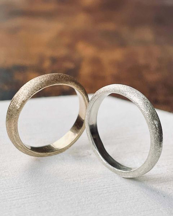 あえて表面に小さな傷や細かい粒子を吹きかけ光沢を抑えることで、存在感がありながらも落ち着いた印象の結婚指輪にすることができます。