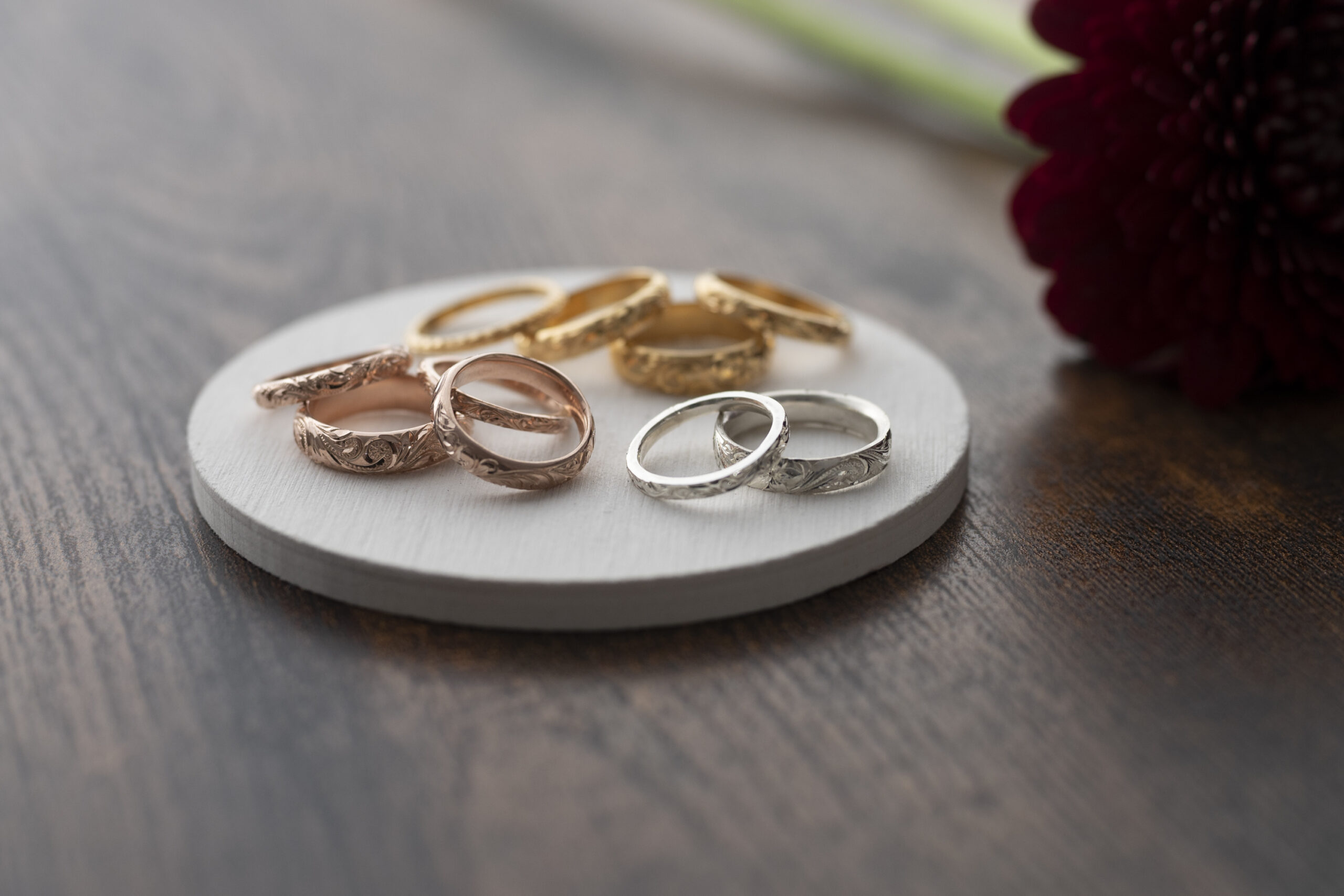 また、ゴールドの結婚指輪で特に人気があるのがハワイアンリングです。ハワイの自然や生き物のモチーフを彫ったもので、一つ一つに意味が込められています。