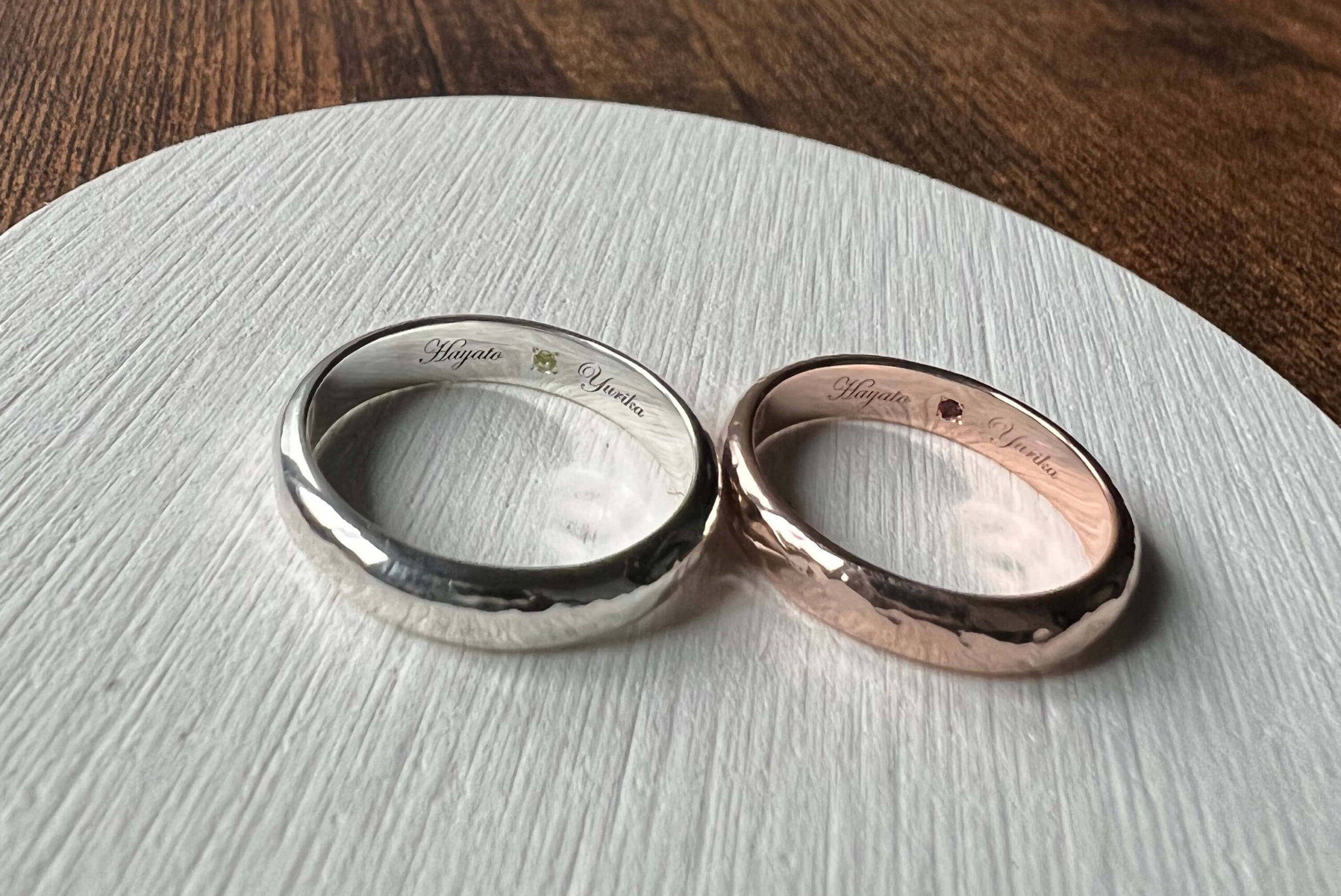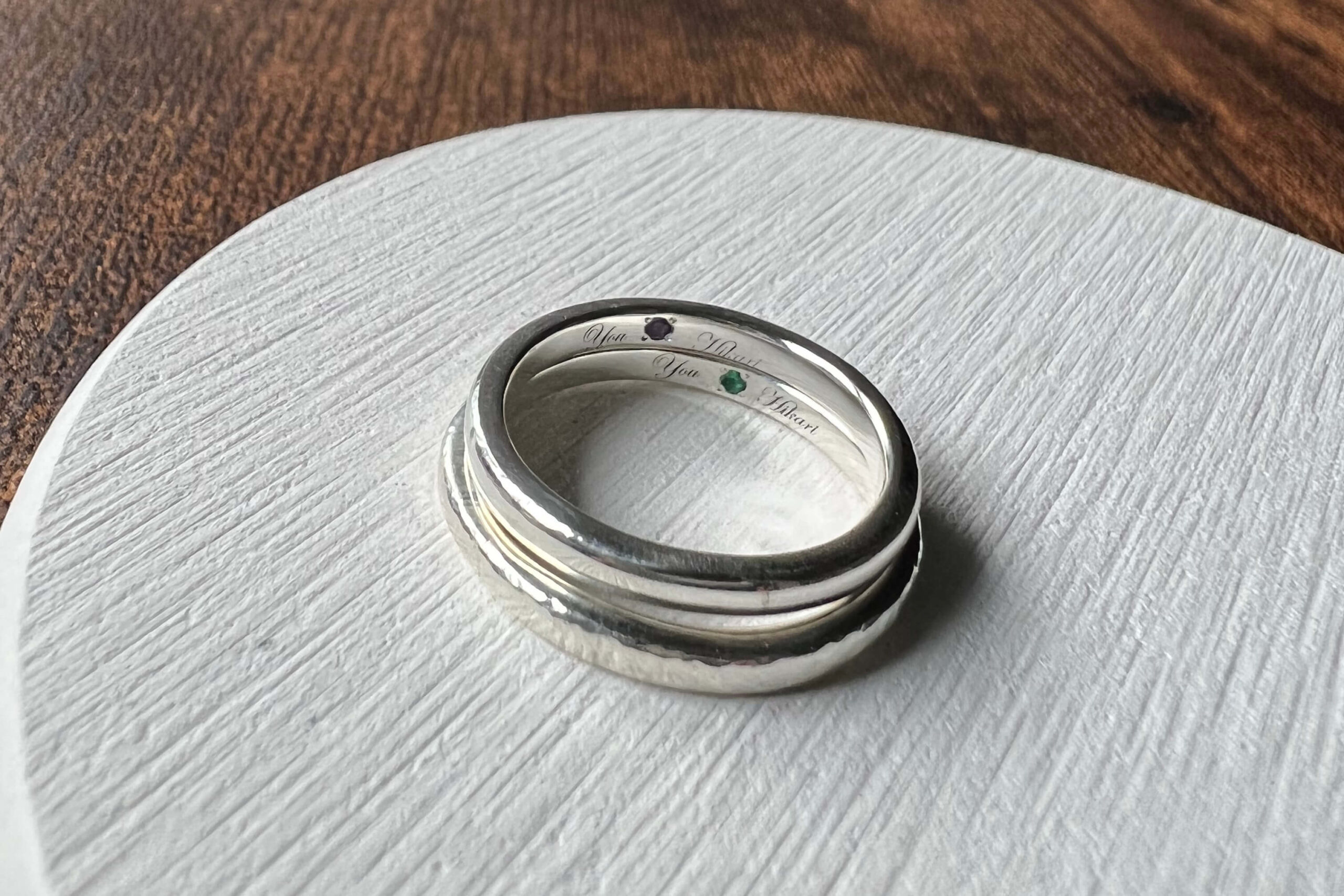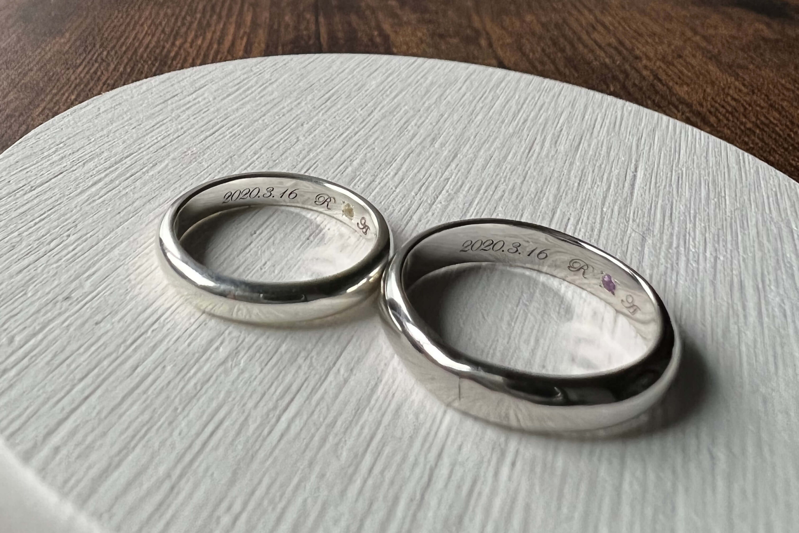 こちらは、記念日とメッセージをそれぞれ別に刻印している事例です。お互いに異なるメッセージを刻印するのも素敵なアイデアです。