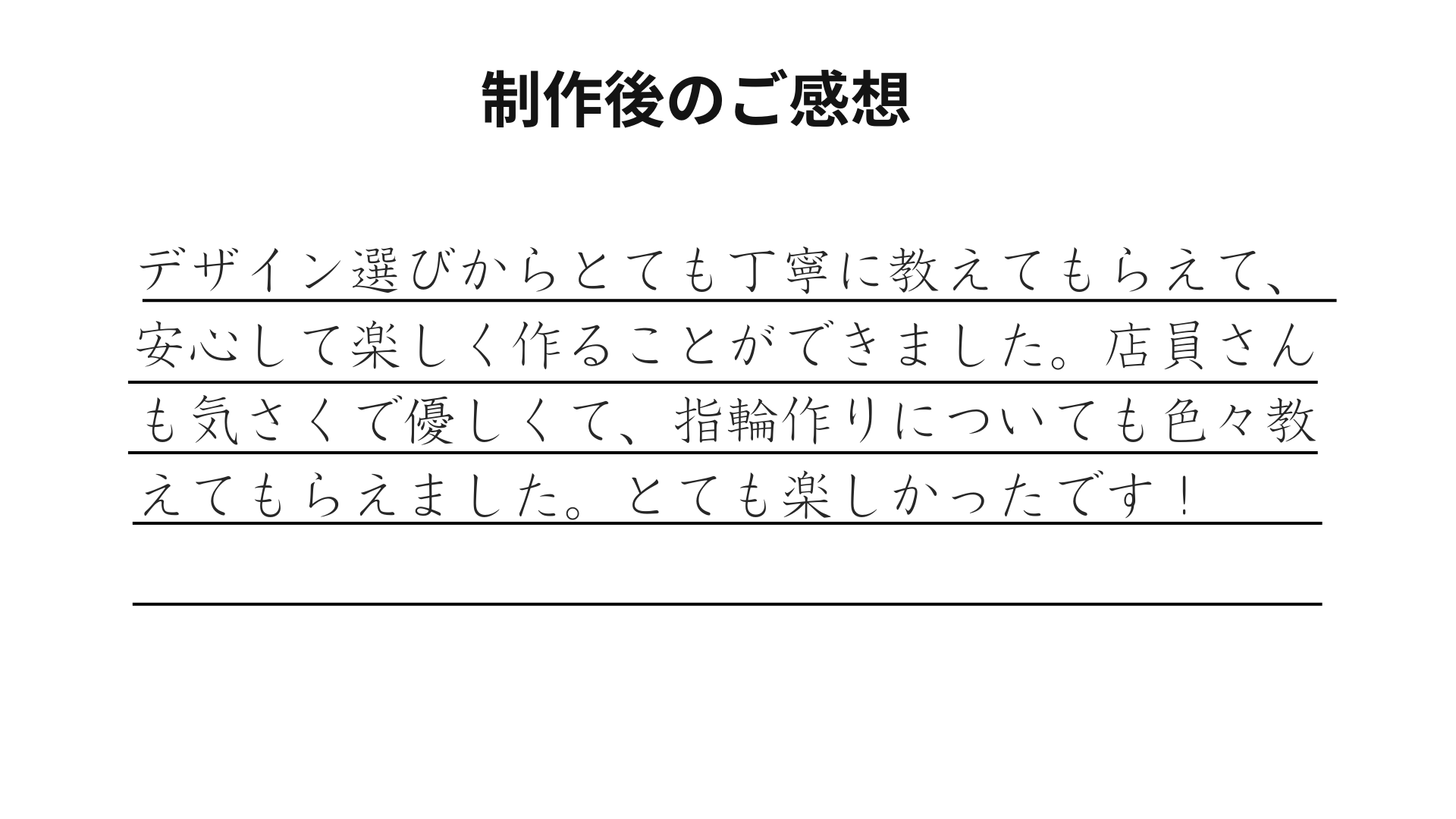 また、スタッフの気さくで優しい対応や指輪作りのご説明もお楽しみいただけたこと、何よりの励みです。