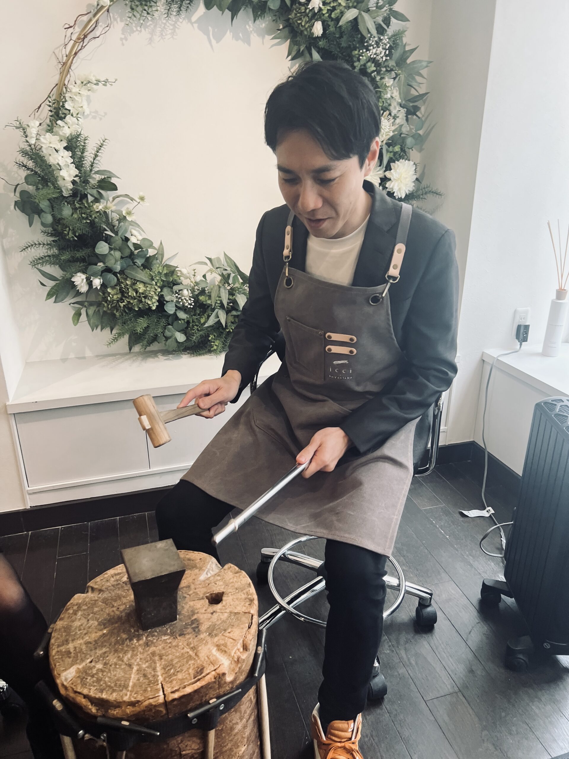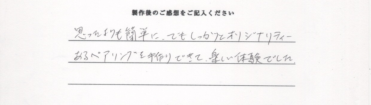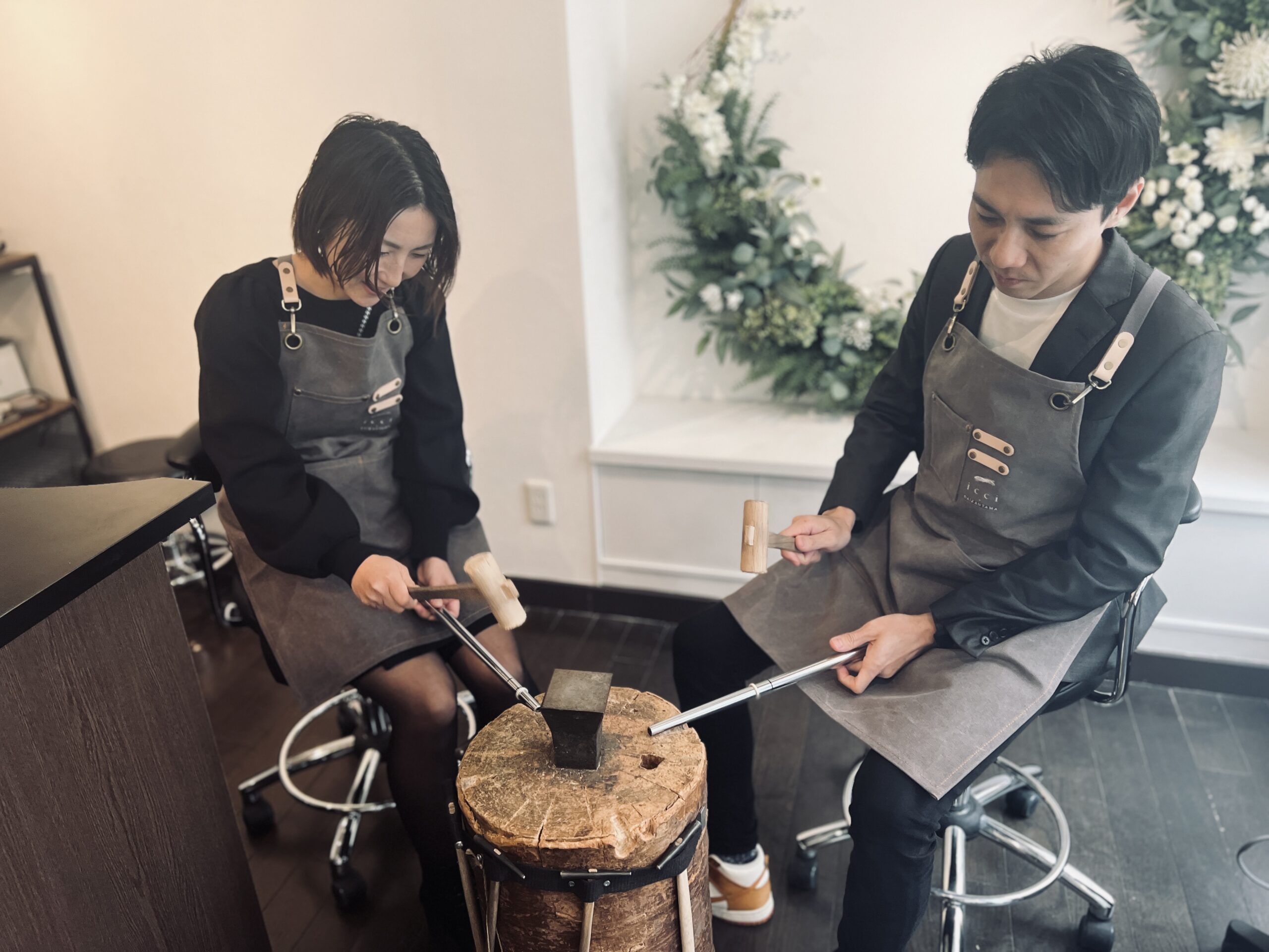 今回ハンマー打ちのデザインを選んでいただき、おふたりの味が出た素敵な仕上がりとなりました。製作を楽しんでいただけたようで、何よりです。末長くご愛用いただけると幸いです。