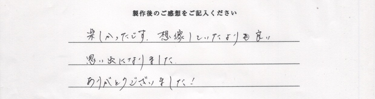 想像していたよりも良かったとおしゃっていただき、大変嬉しいです。楽しかった制作の思い出と一緒に、是非手作りのリングをご愛用くださいませ。