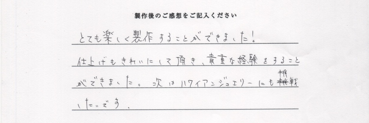 ハワイアンリングにもご興味を示されており、次回はハワイアンのデザインに刻印等も入れたいなどとおっしゃっており、嬉しく思います。またお会いできるのを当店のスタッフ一同楽しみにしております。