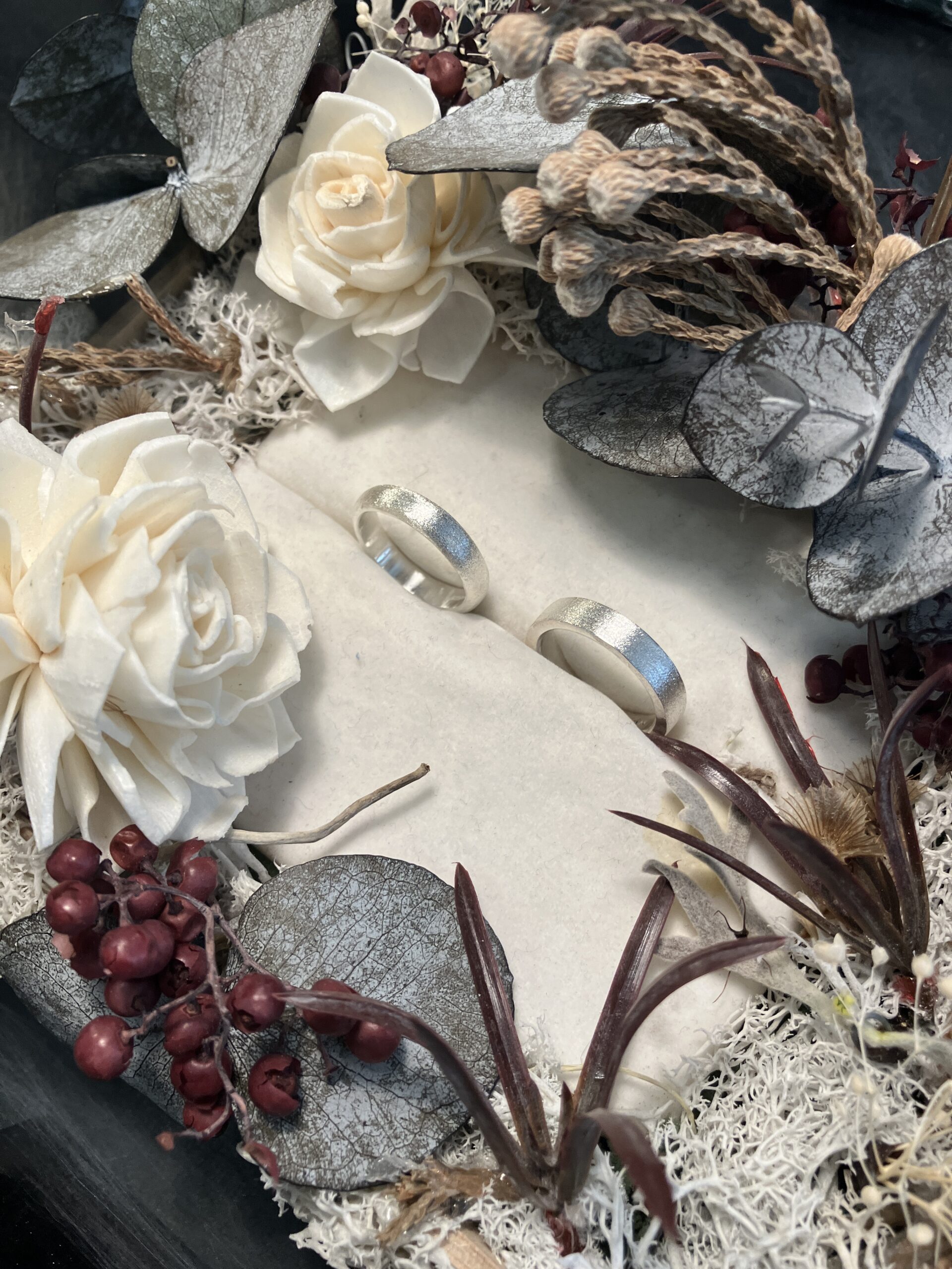 デザインの方はスターダストがお揃いで、甲丸と平打ちのリング、カラーもご一緒ということで、お揃いのペアリングといった感じで、素敵なものに仕上がると思います。