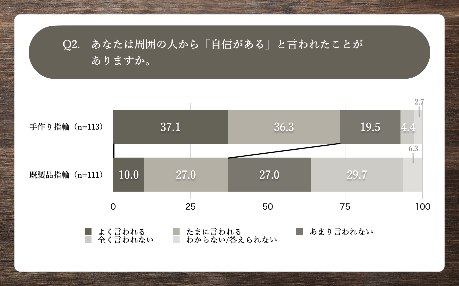 「Q2.あなたは周囲の人から「自信がある」と言われたことがありますか。」と質問したところ、手作り指輪購入の夫婦(n=113)は「よく言われる」が37.1%、「たまに言われる」が36.3%、既製品指輪購入の夫婦(n=111)は「よく言われる」が10.0%、「たまに言われる」が27.0%という回答となりました。