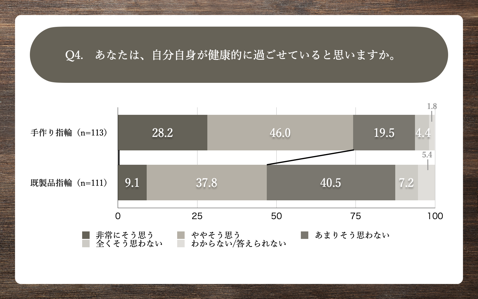 「Q4.あなたは、自分自身が健康的に過ごせていると思いますか。」と質問したところ、手作り指輪購入の夫婦(n=113)は「非常にそう思う」が28.2%、「ややそう思う」が46.0%、既製品指輪購入の夫婦(n=111)は「非常にそう思う」が9.1%、「ややそう思う」が37.8%という回答となりました。