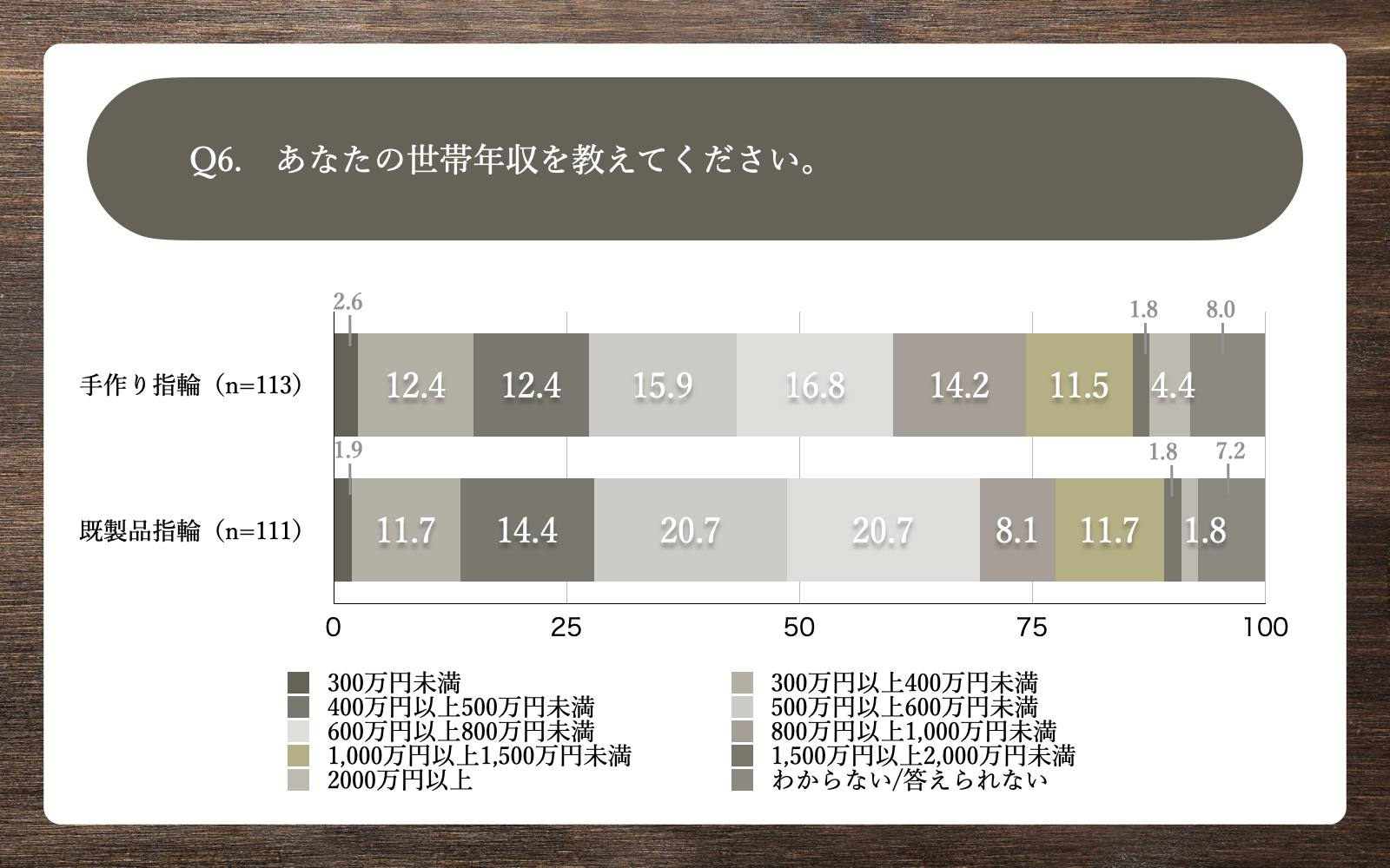 「Q6.あなたの世帯年収を教えてください。」と質問したところ、手作り指輪購入の夫婦(n=113)は「500万円以上600万円未満」が15.9%、「600万円以上800万円未満」が16.8%、既製品指輪購入の夫婦(n=111)は「500万円以上600万円未満」が20.7%、「600万円以上800万円未満」が20.7%という回答となりました。