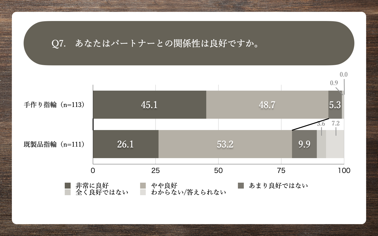 「Q7.あなたはパートナーとの関係性は良好ですか。」と質問したところ、手作り指輪購入の夫婦(n=113)は「非常に良好」が45.1%、「やや良好」が48.7%、既製品指輪購入の夫婦(n=111)は「非常に良好」が26.1%、「やや良好」が53.2%という回答となりました。