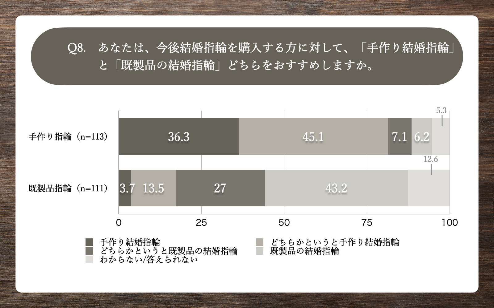 「Q8.あなたは、今後結婚指輪を購入する方に対して、「手作り結婚指輪」と「既製品の結婚指輪」どちらをおすすめしますか。」と質問したところ、手作り指輪購入の夫婦(n=113)は「手作り結婚指輪」が36.3%、「どちらかというと手作り結婚指輪」が45.1%、既製品指輪購入の夫婦(n=111)は「手作り結婚指輪」が3.7%、「どちらかというと手作り結婚指輪」が13.5%という回答となりました。