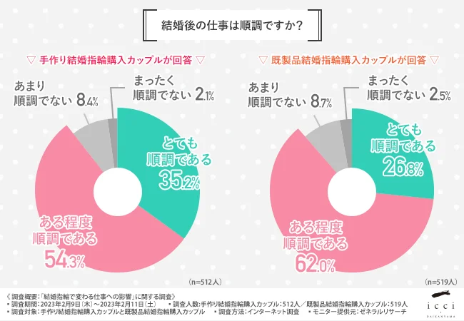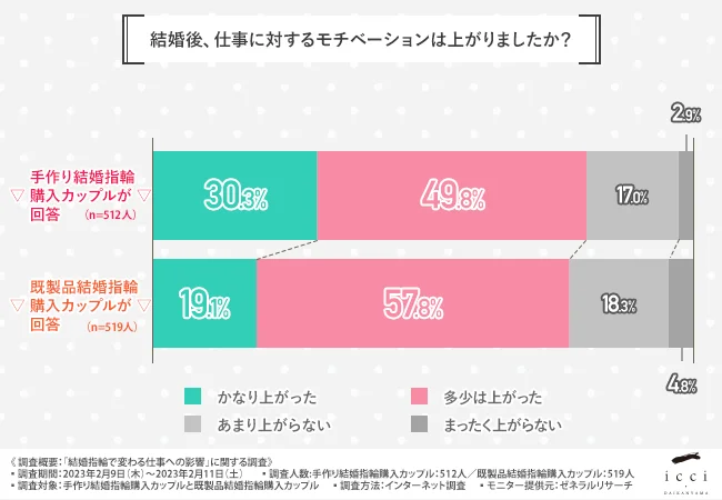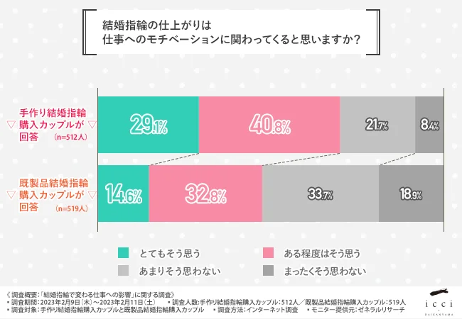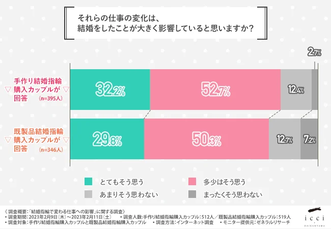 そこで、代官山の手作り結婚指輪・婚約指輪専門店「icci 代官山」(https://www.1-daikanyama.jp/)を運営する株式会社一は、手作り結婚指輪を購入したカップルと既製品結婚指輪を購入したカップルを対象に、「結婚指輪で変わる仕事への影響」に関する調査を実施しました。
