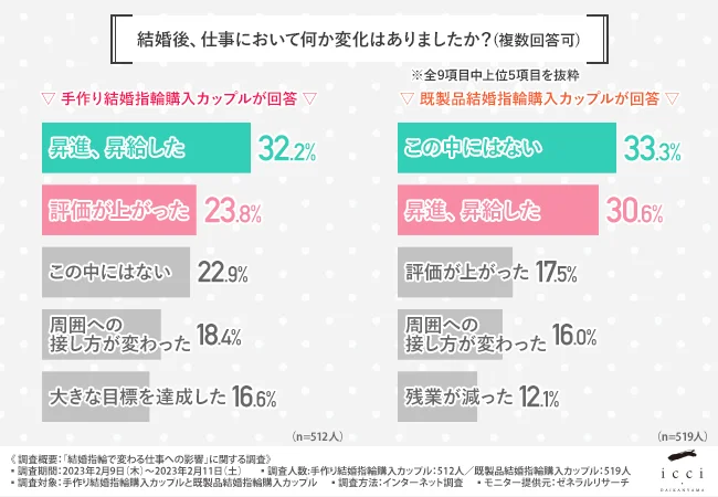 【手作り結婚指輪購入カップル】『昇進、昇給した(32.2%)』『評価が上がった(23.8%)』『この中にはない(22.9%)』『周囲への接し方が変わった(18.4%)』『大きな目標を達成した(16.6%)』『仕事がはかどるようになった、効率が良くなった(15.8%)』『周囲からの接し方や反応が変わった(14.5%)』『残業が減った(13.5%)』