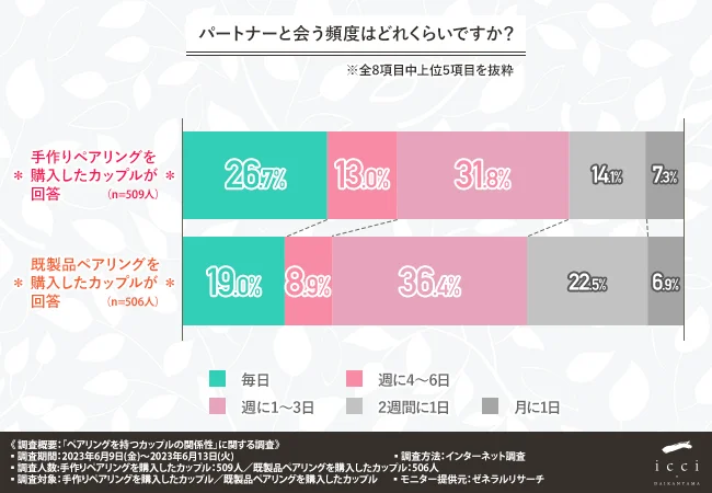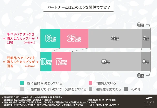 そこで今回、手作りペアリングの制作体験ができるicci 代官山(https://www.1-daikanyama.jp/)を運営する株式会社一は、手作りペアリングを購入したカップルと既製品ペアリングを購入したカップルを対象に、「ペアリングを持つカップルの関係性」に関する調査を実施しました。