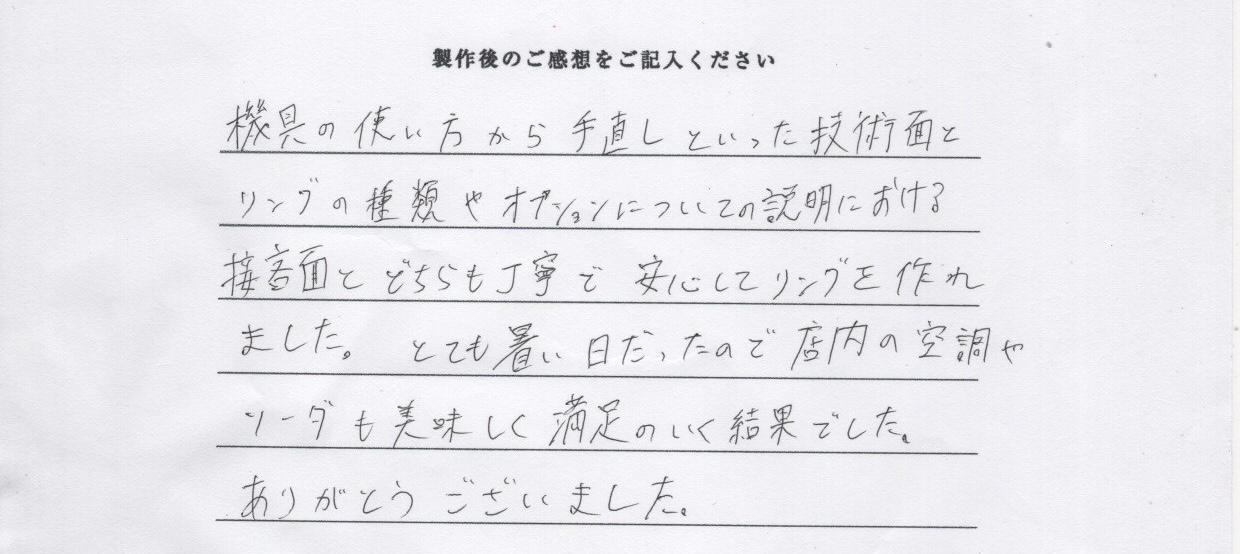 機具の使い方から手直しといった技術面とリングの種類やオプションについての説明における接客面とどちらも丁寧で安心してリングを作れました。とても暑い日だったので店内の空調やソーダも美味しく満足のいく結果でした。ありがとうございました。