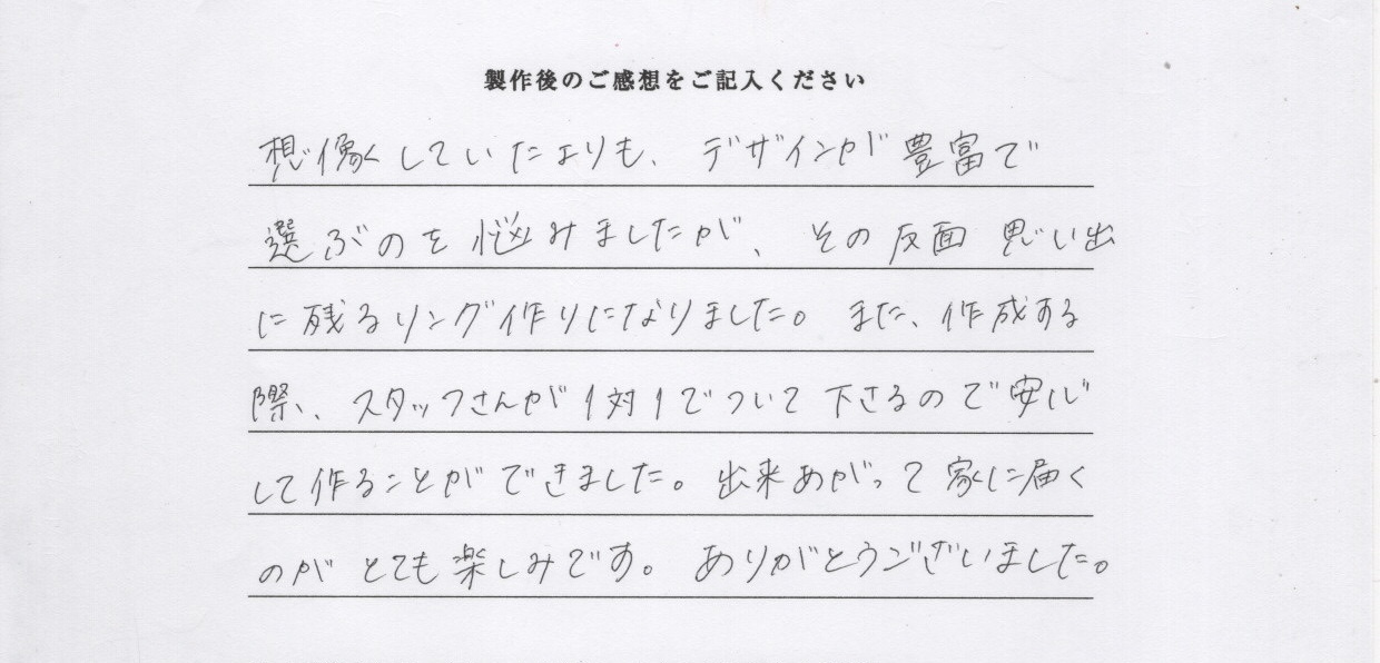 想像していたよりも、デザインが豊富で選ぶのを悩みましたが、その反面思いでに残るリング作りになりました。また、作成する際、スタッフさんが1対1でついてくださるので安心して作ることができました。出来あがって家に届くのがとても楽しみです。ありがとうございました。