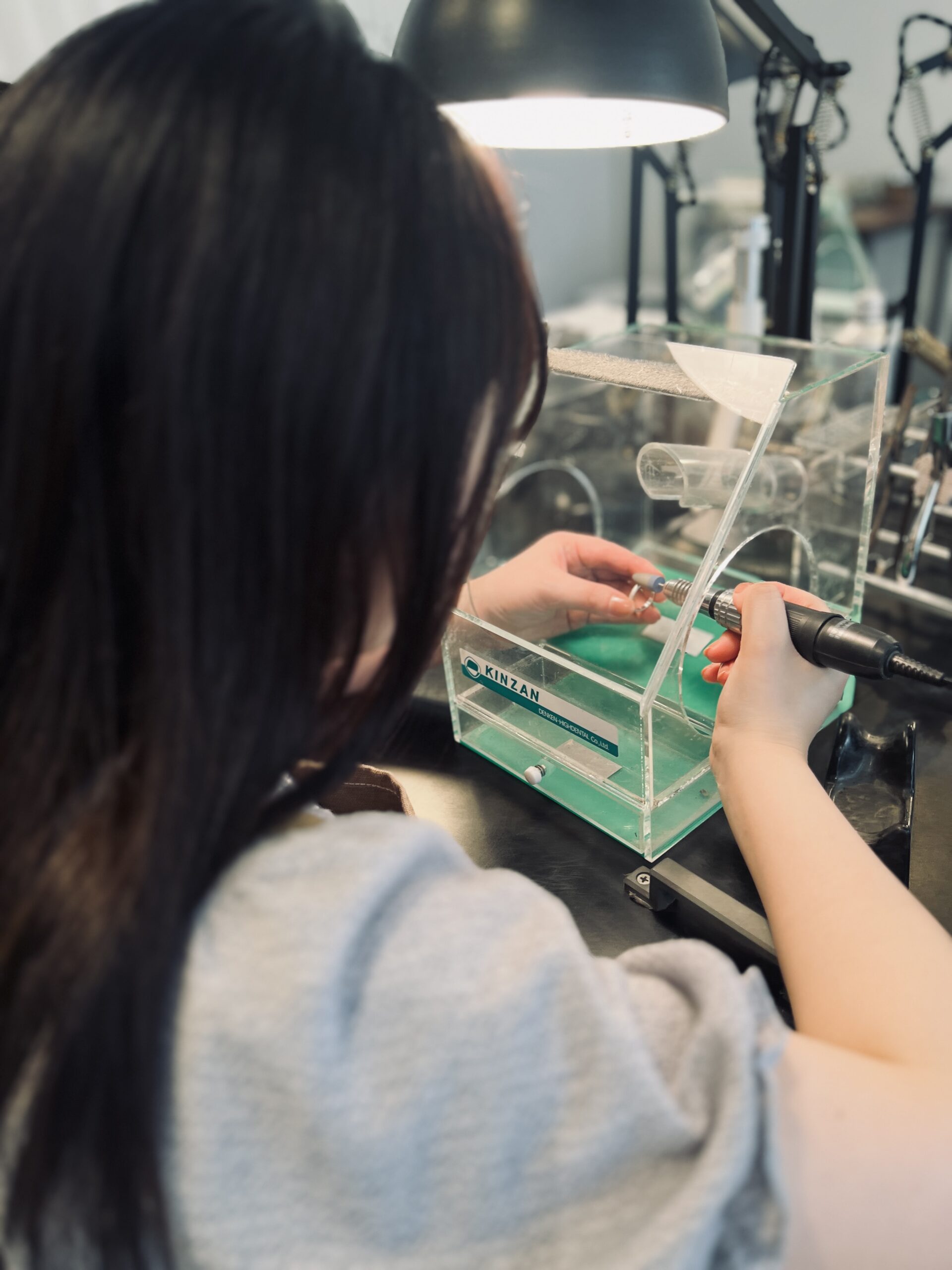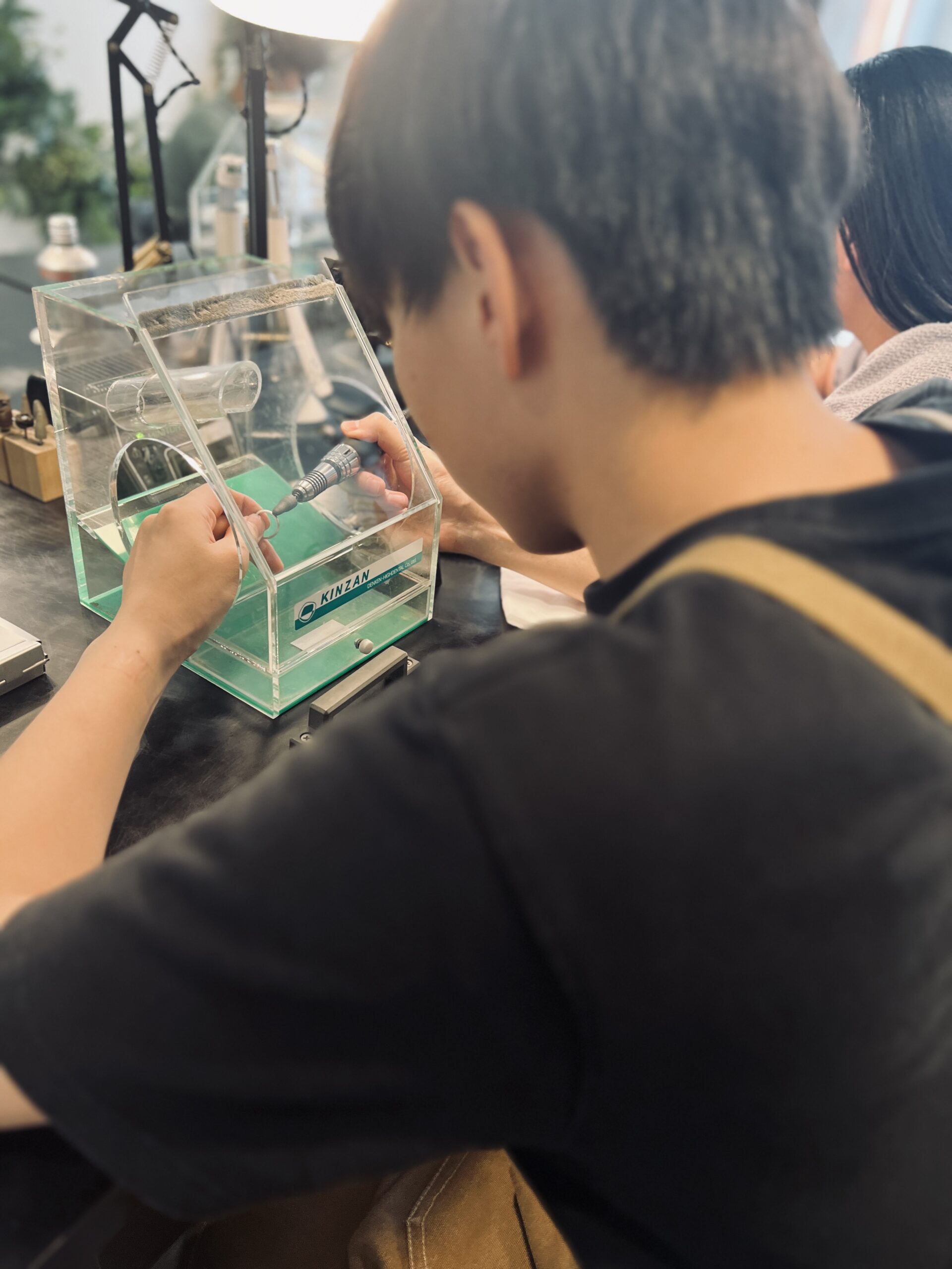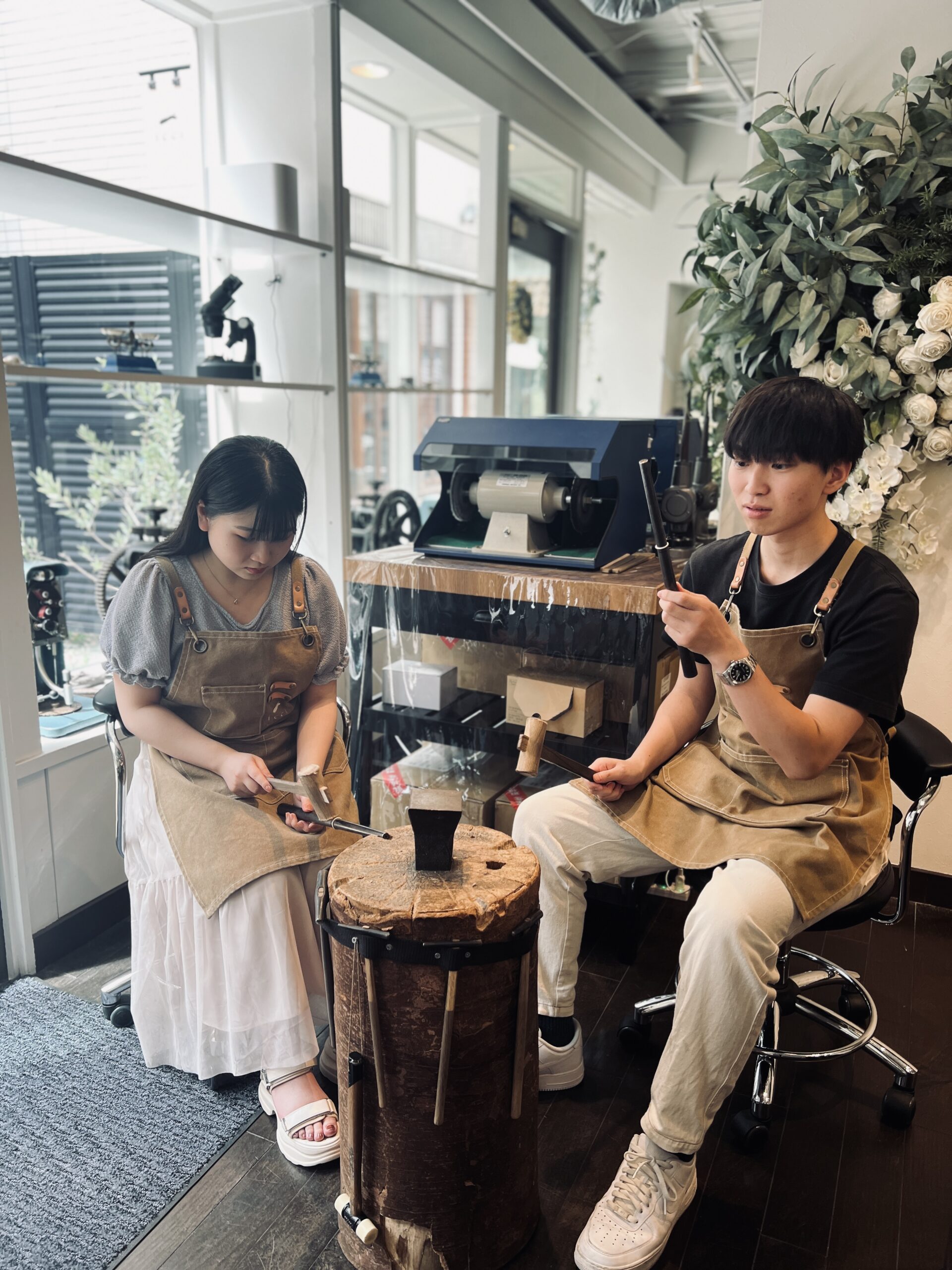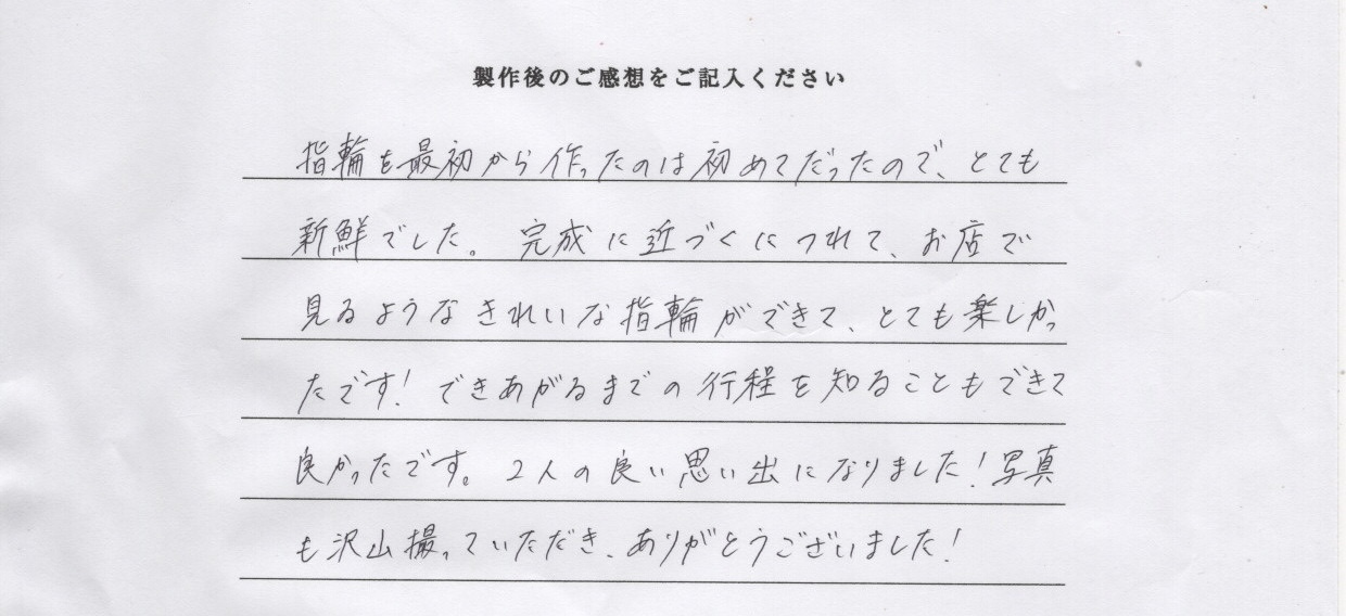 指輪を最初から作ったのは初めてだったので、とても新鮮でした。完成に近づくにつれて、お店で見るようなきれいな指輪ができて、とても楽しかったです!できあがるまでの行程を知ることもできて良かったです。2人の良い思い出になりました!写真もたくさん撮っていただき、ありがとうございました!