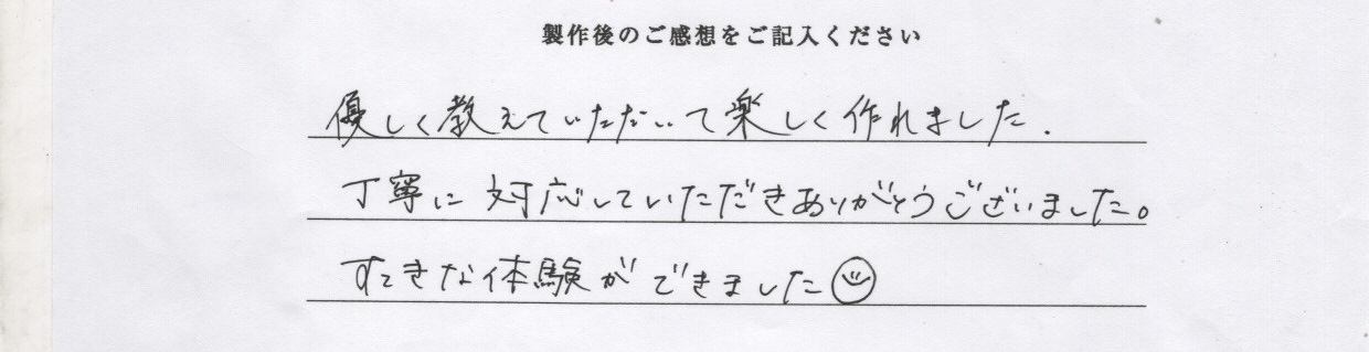 優しく教えていただいて楽しく作れました。丁寧に対応していただきありがとうございました。すてきな体験ができました。
