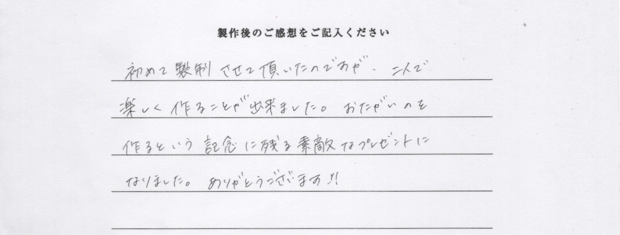 初めて製作させて頂いたのですが、二人で楽しく作ることが出来ました。おたがいのを作るという記念に残る素敵なプレゼントになりました。ありがとうございます!!