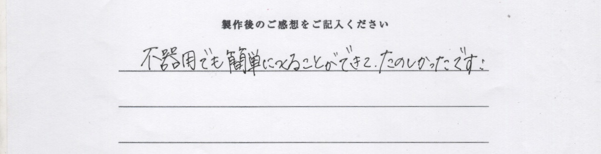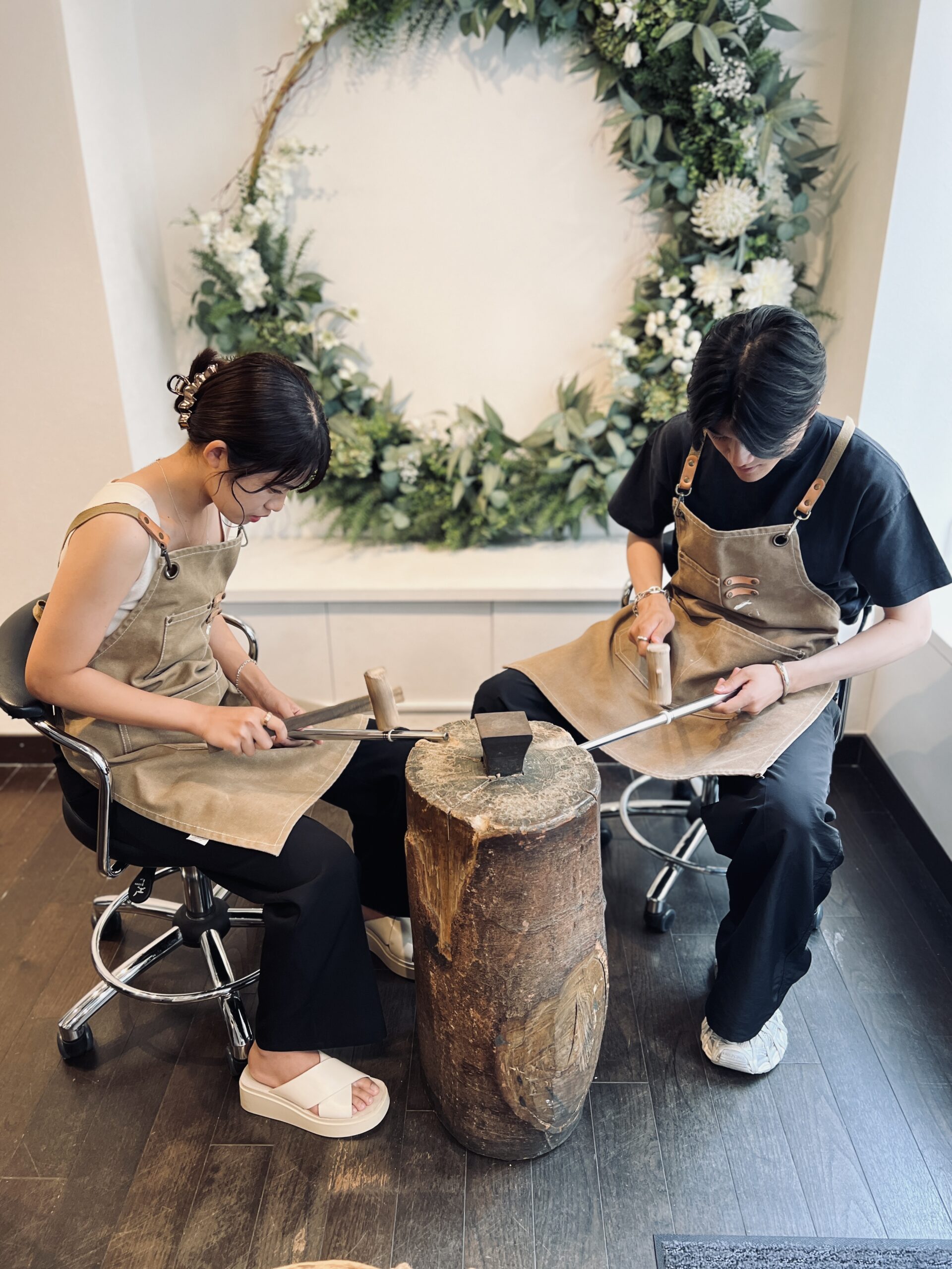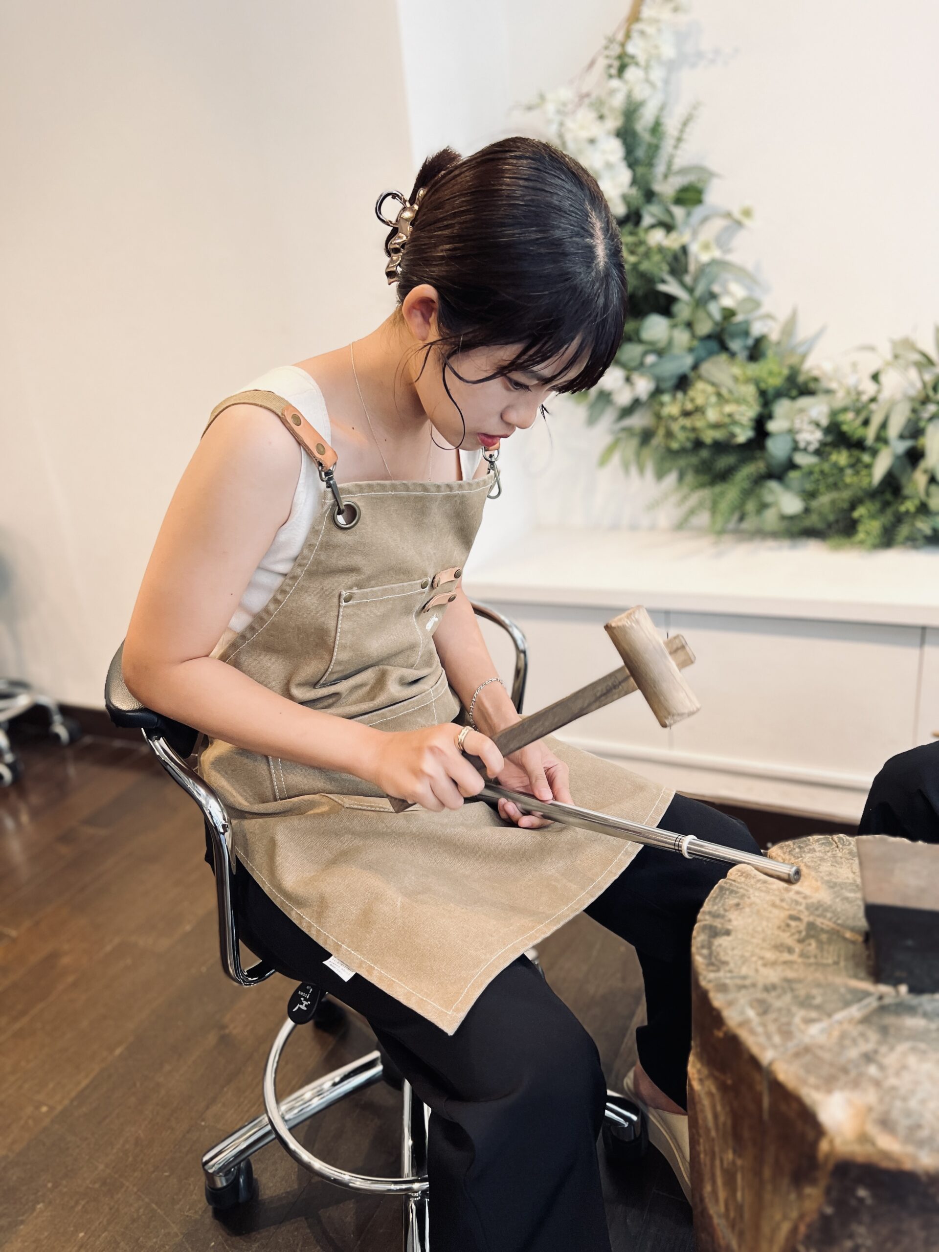 製作を楽しみにしておられたようで、最初からやる気十分なご様子でした。工程も楽しんでいただけ、当日の仕上がりもとても喜んでいただけたので、こちらも嬉しくなりました。加工でしばらくお預かりしますが、お手元に届きましたら是非ご愛用くださいませ。