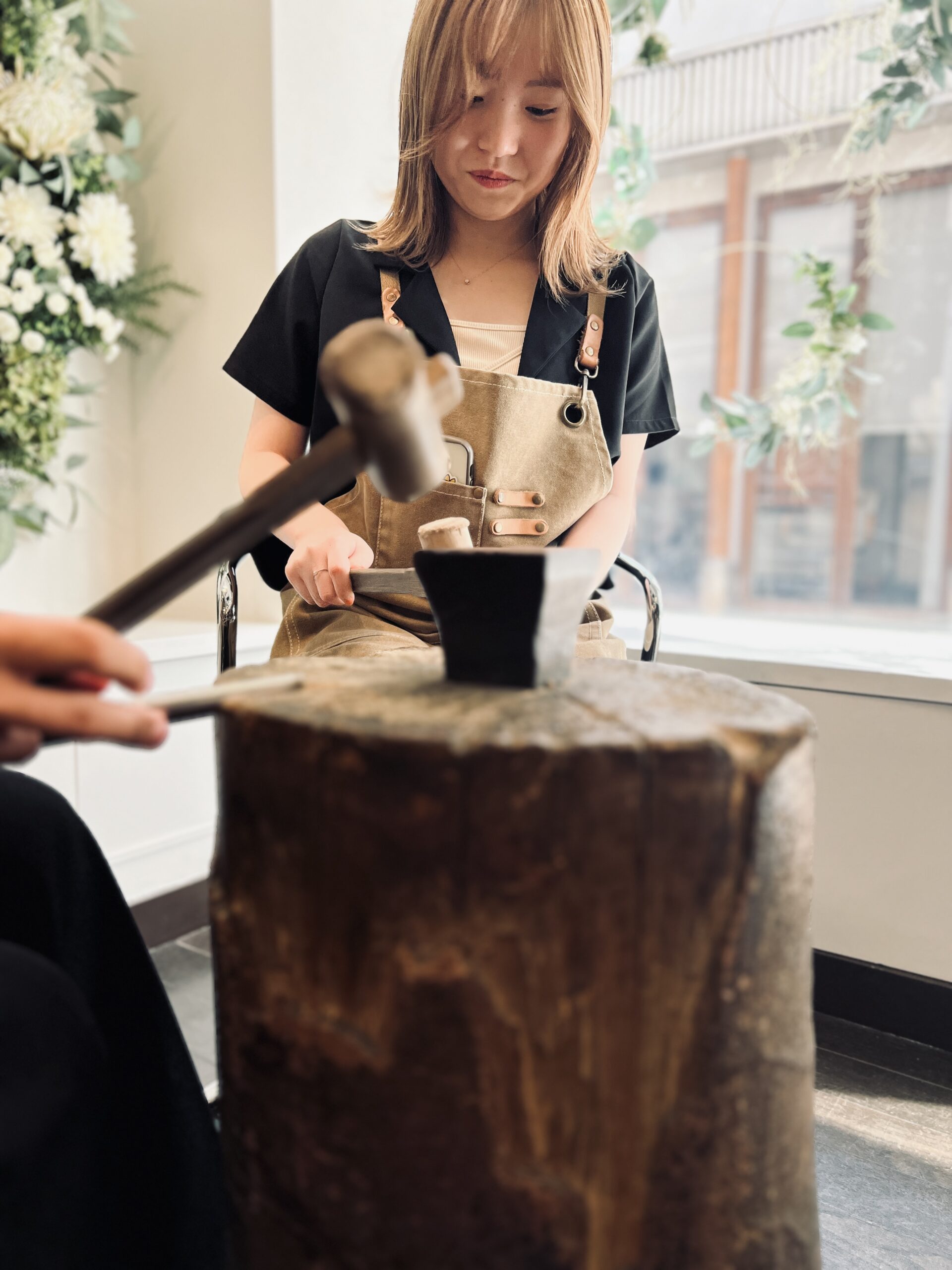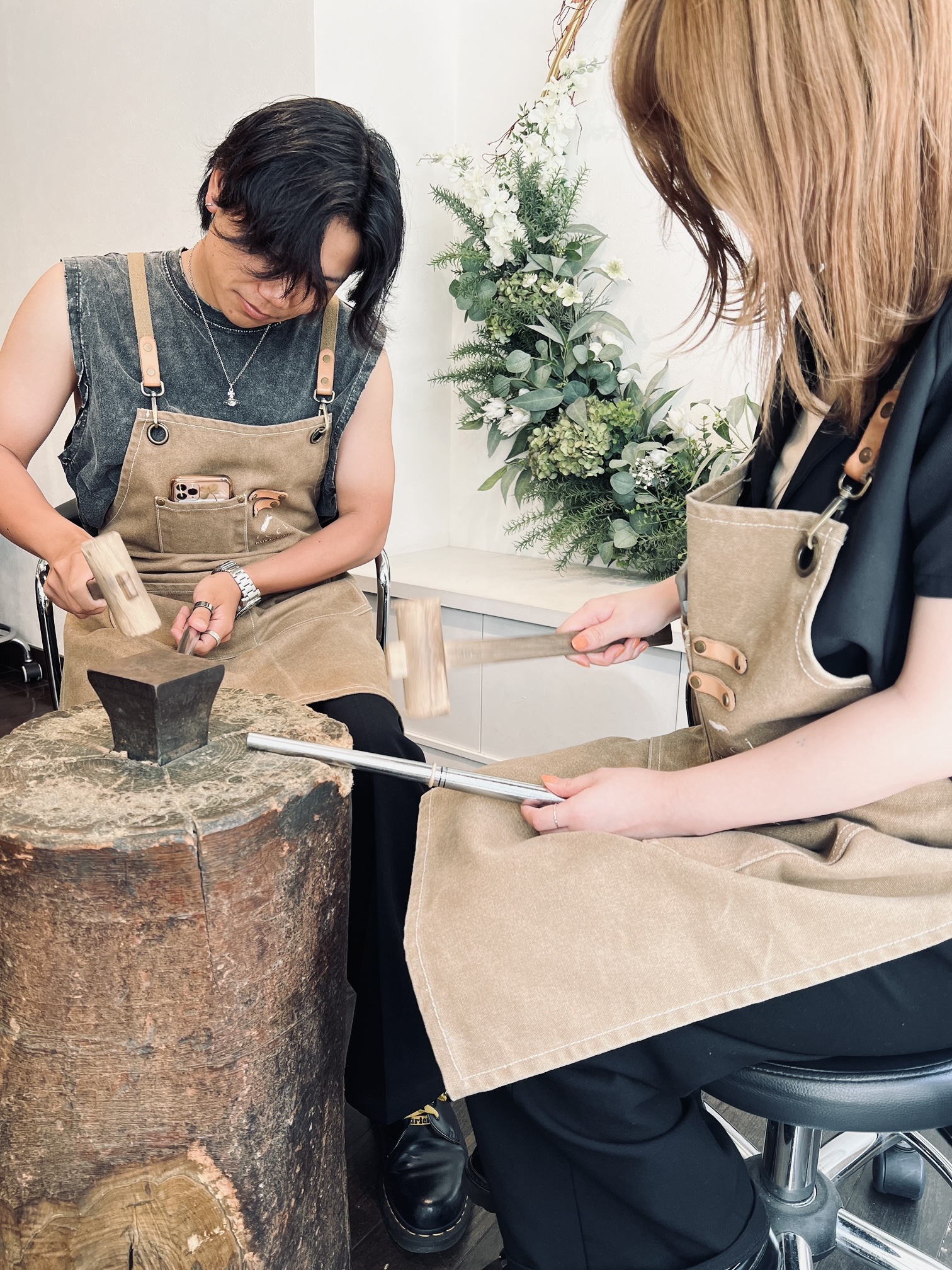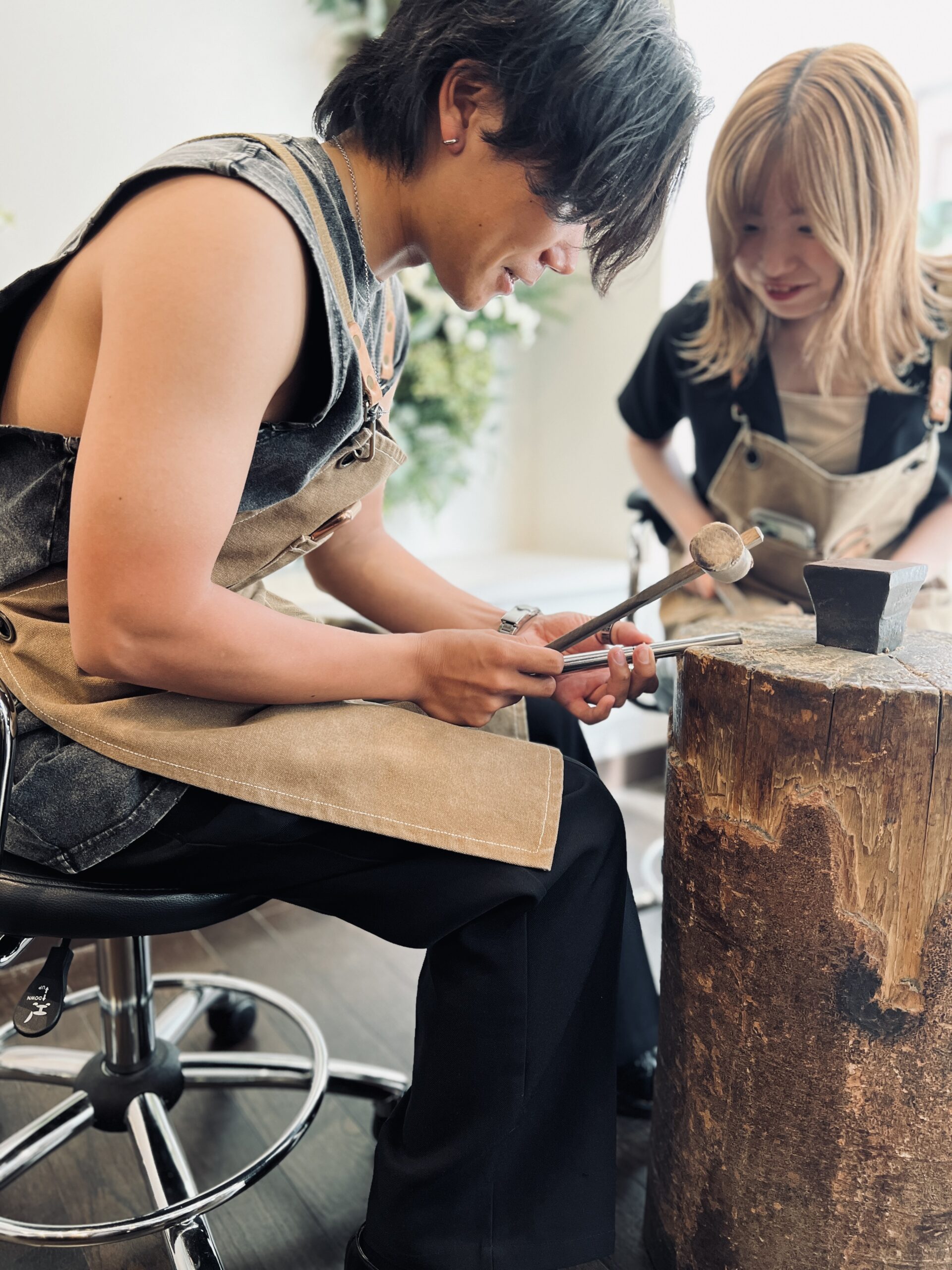 指輪をハンマーで叩いてサイズを調整する工程に少し苦労されましたが、それもおふたりの手作り指輪の思い出になれば幸いです。加工が終わりましたら、是非お手元でご愛用くださいませ。ご来店誠にありがとうございました!