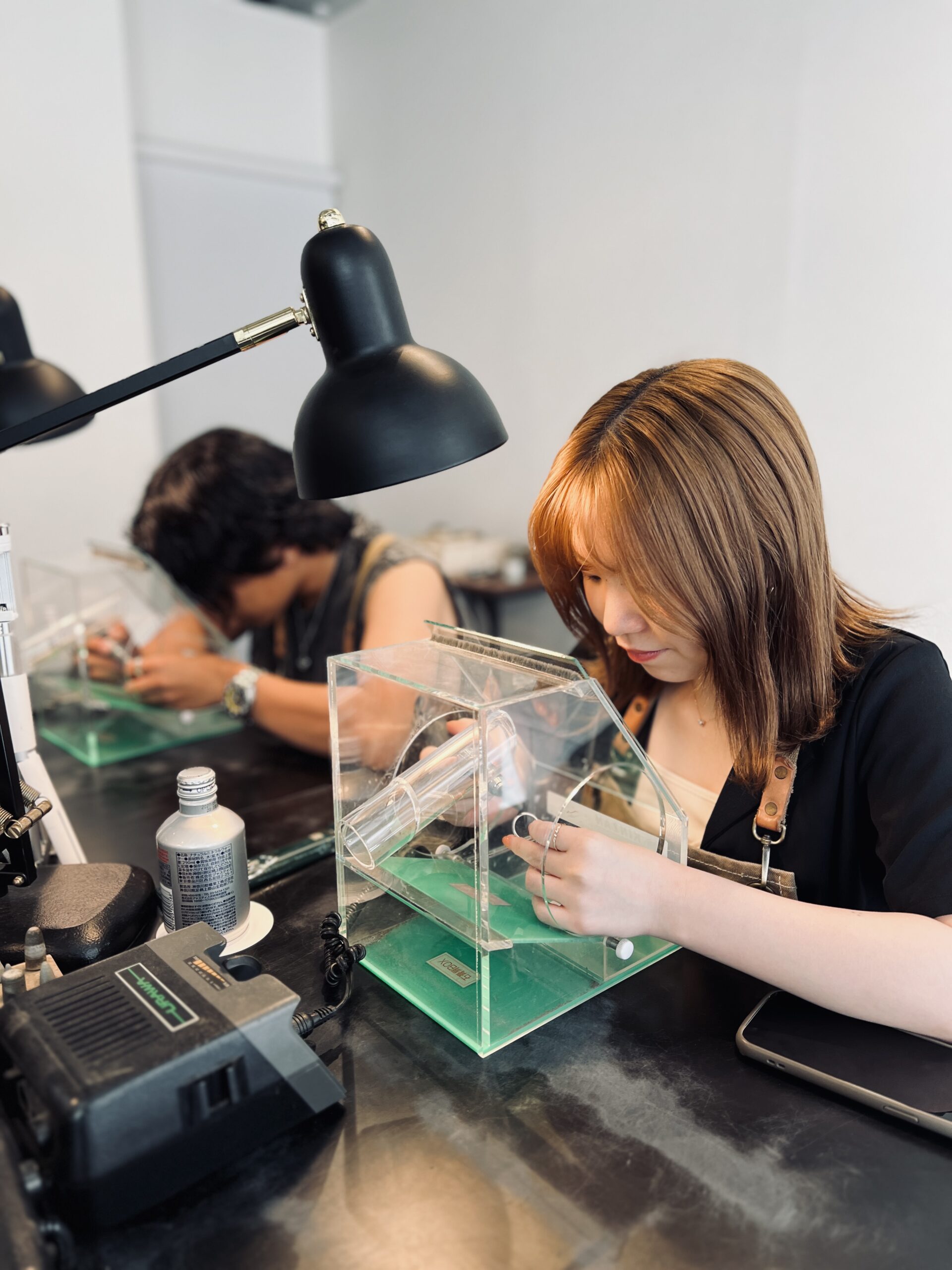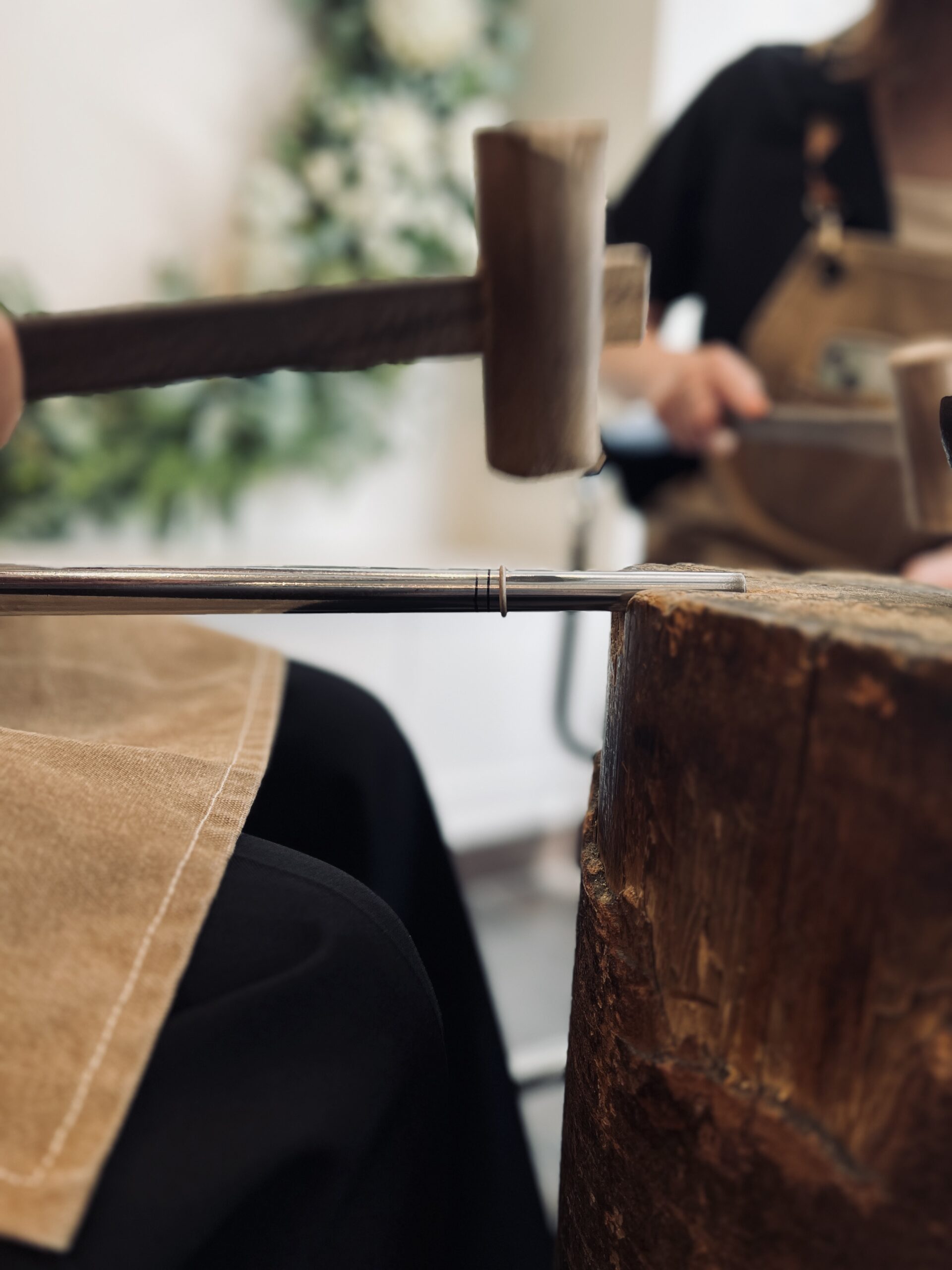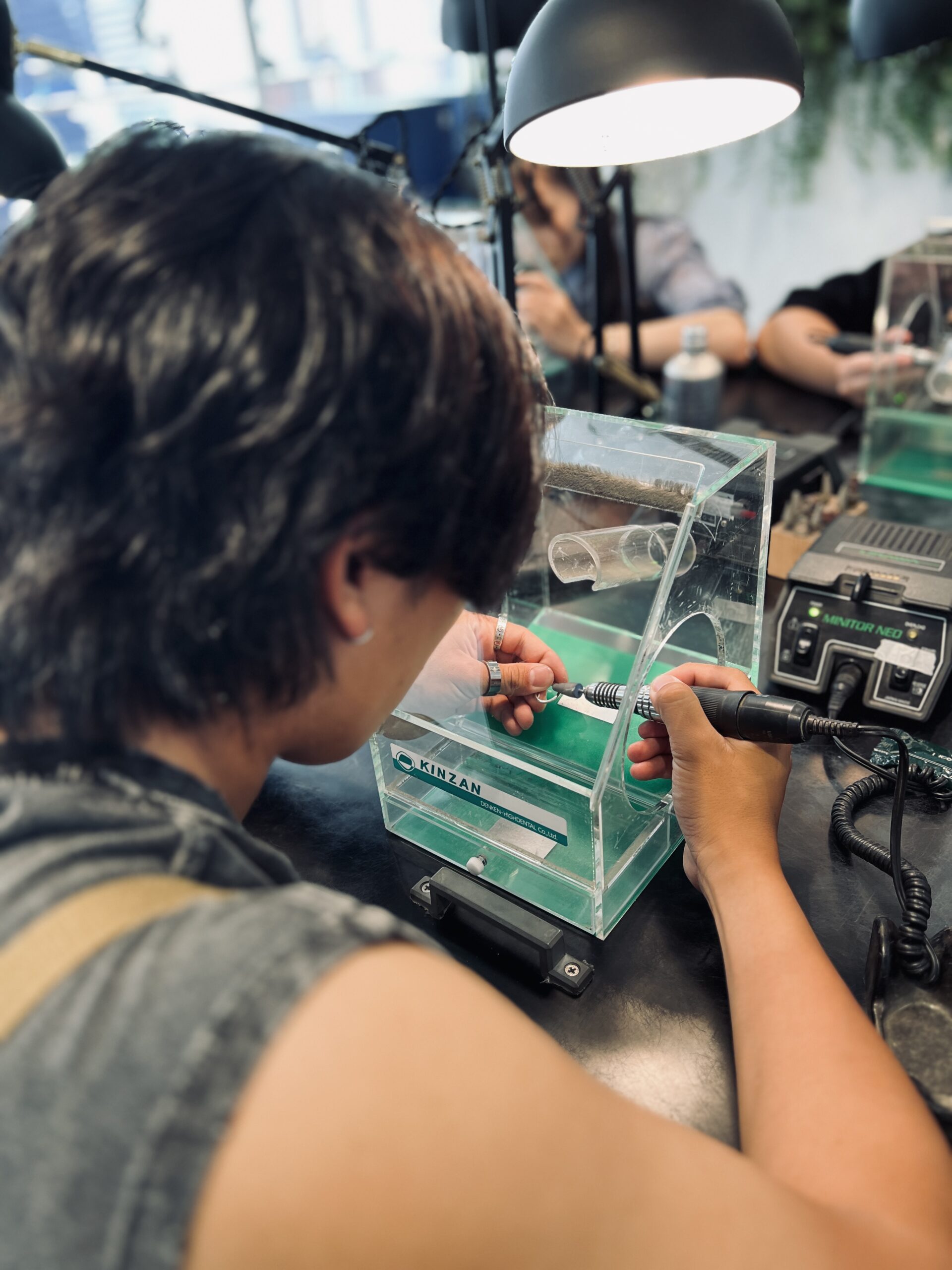 指輪をハンマーで叩いてサイズを調整する工程に少し苦労されましたが、それもおふたりの手作り指輪の思い出になれば幸いです。加工が終わりましたら、是非お手元でご愛用くださいませ。ご来店誠にありがとうございました!