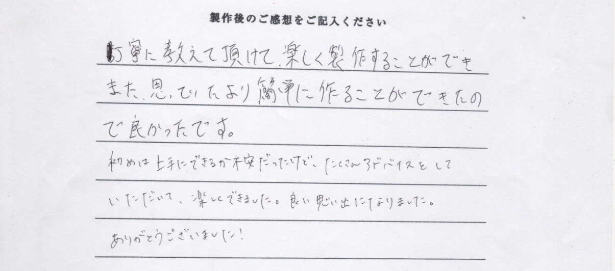 丁寧に教えて頂けて楽しく製作することができました。思ってたより簡単に作ることができたので良かったです。