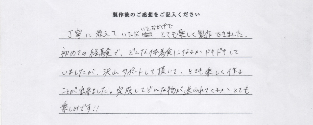初めての体験でどんな体験になるかドキドキしていましたが、沢山サポートでて頂いてとても楽しく作ることが出来ました。完成してどんな物が送られてくるか、とても楽しみです!!