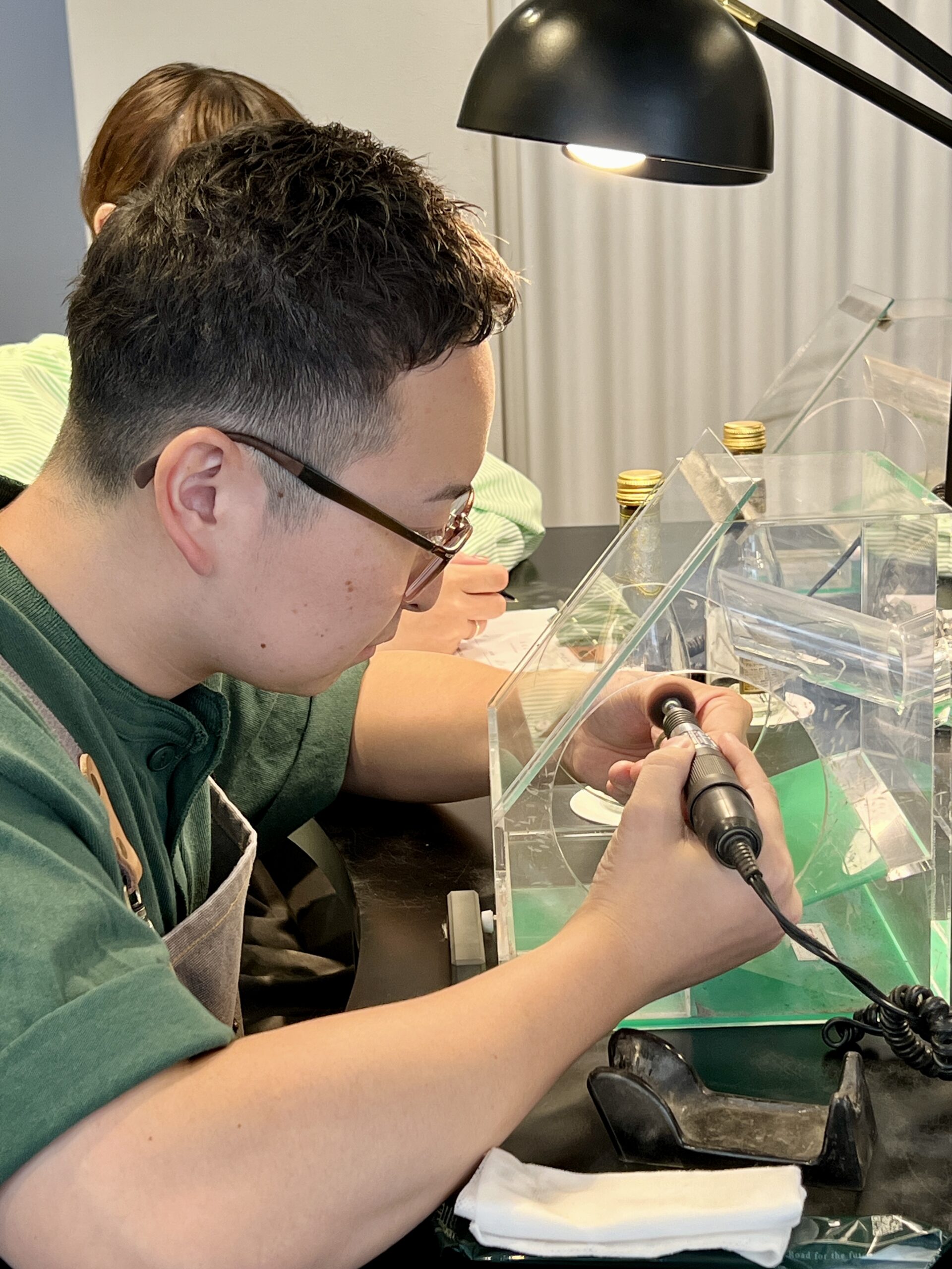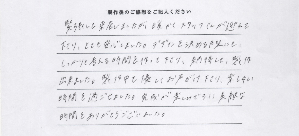 緊張して来店しましたが暖かくスタッフさんが迎えて下さり、とても安心しました。デザインを決める際にもしっかりと考える時間を作って下さり、納得して製作出来ました。製作中も優しくお声がけ下さり、楽しい時間を過ごせました。完成が楽しみです!!素敵な時間をありがとうございました。