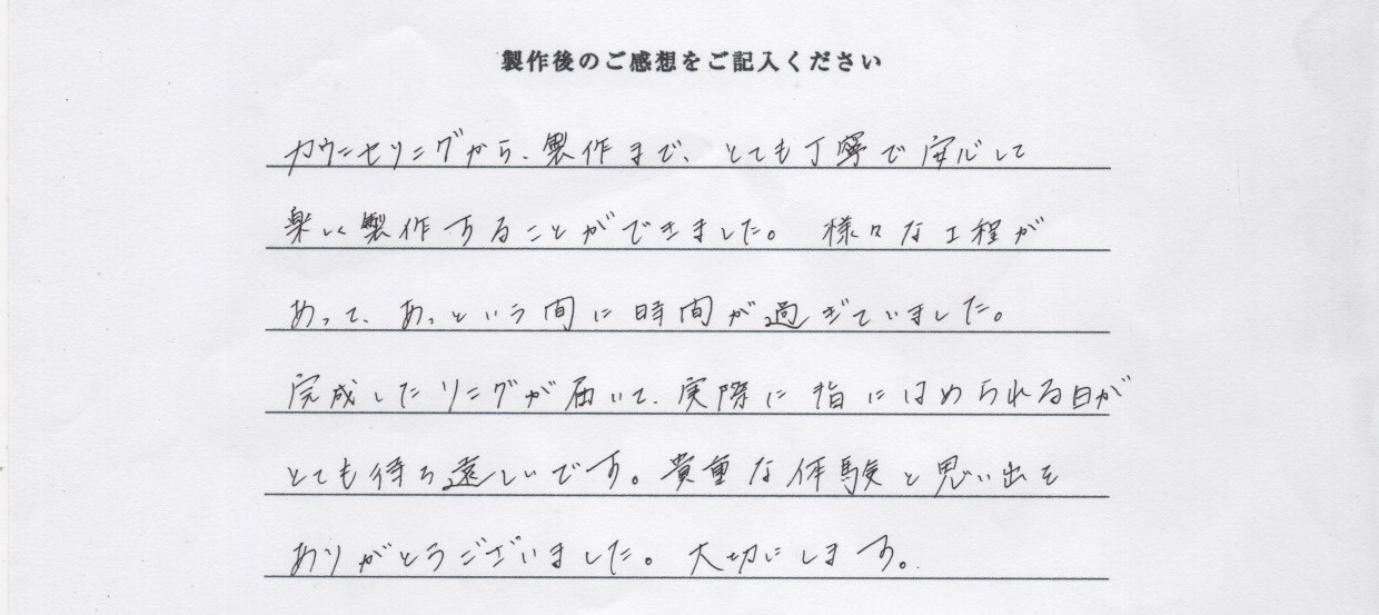 カウンセリングから製作まで、とても丁寧で安心して楽しく製作することができました。様々な工程があって、あっという間に時間が過ぎていました。完成したリングが届いて、実際に指にはめられる日がとても待ち遠しいです。貴重な体験と思い出をありがとうございました。大切にします。
