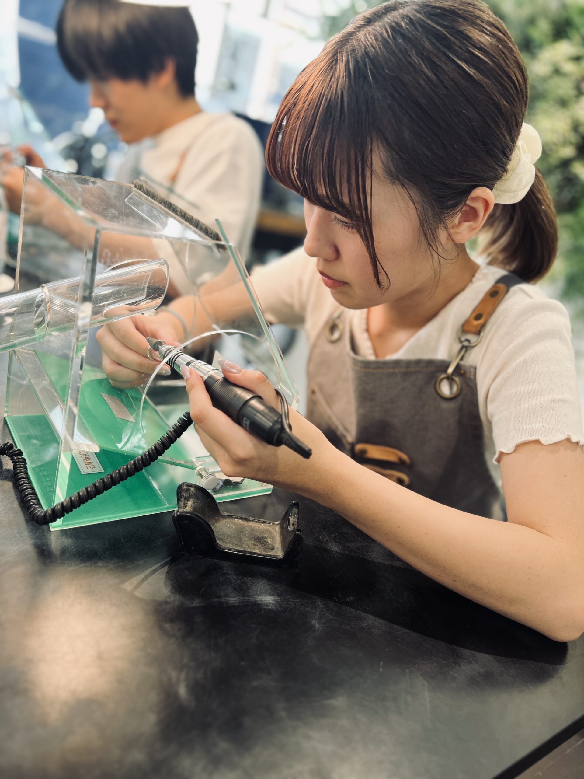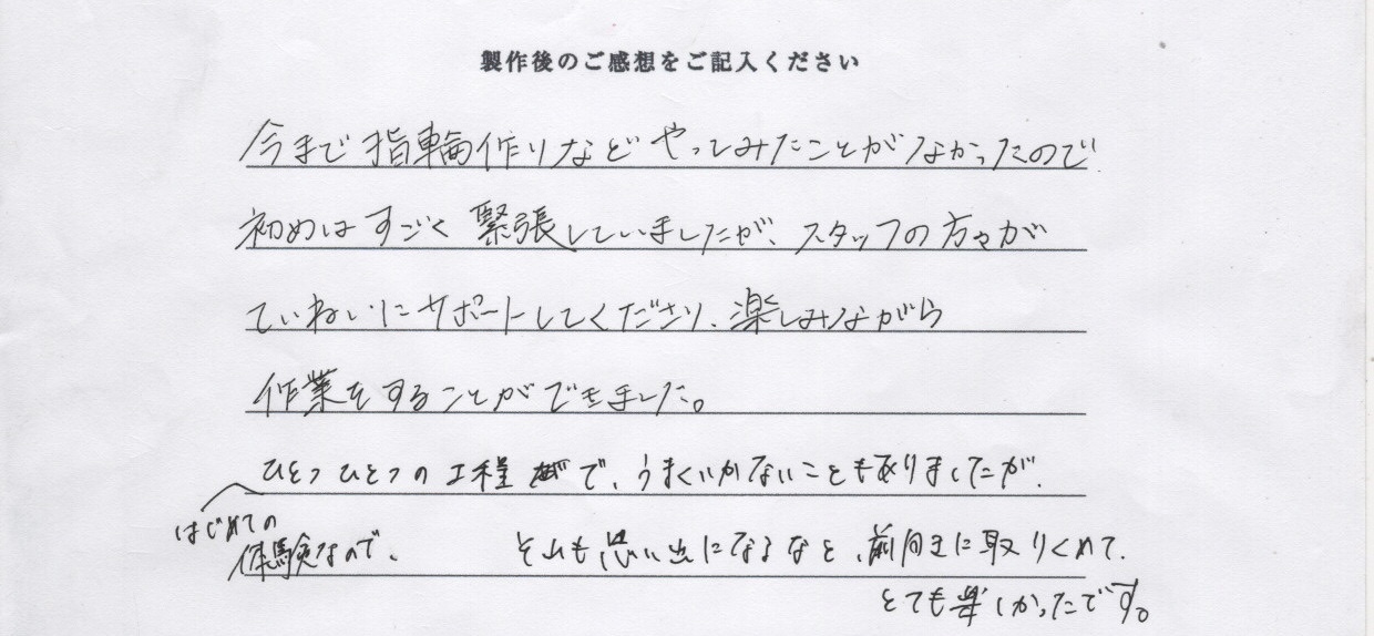 今まで指輪作りなどやってみたことがなかったので初めはすごく緊張していましたが、スタッフの方々がていねいにサポートしてくださり、楽しみながら作業することができました。