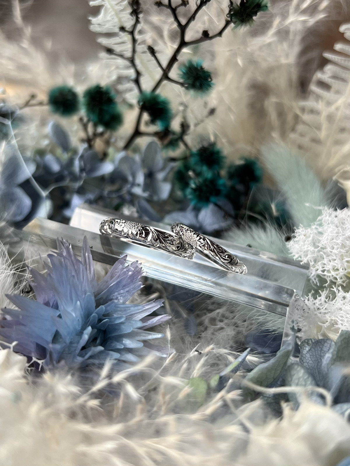 全てフリーハンドによるicciイチオシのハワイアン彫刻アーティストによるハワイアンマリッジリングを制作して頂きました。お好みの絵柄をお選び頂きリング2本を重ねることで1つの絵柄のヒマワリもチョイス。その他にもお花やウミガメなどもあり悩まされてましたが。。4mmと3mm幅のリングで重厚感がありながらエレガントな仕上がりになりました!ありがとうございました