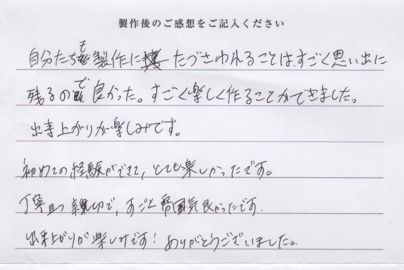 自分たちも制作に携われることはすごく思い出に残るので良かった。すごく楽しく作ることができました。出来上がりが楽しみです。