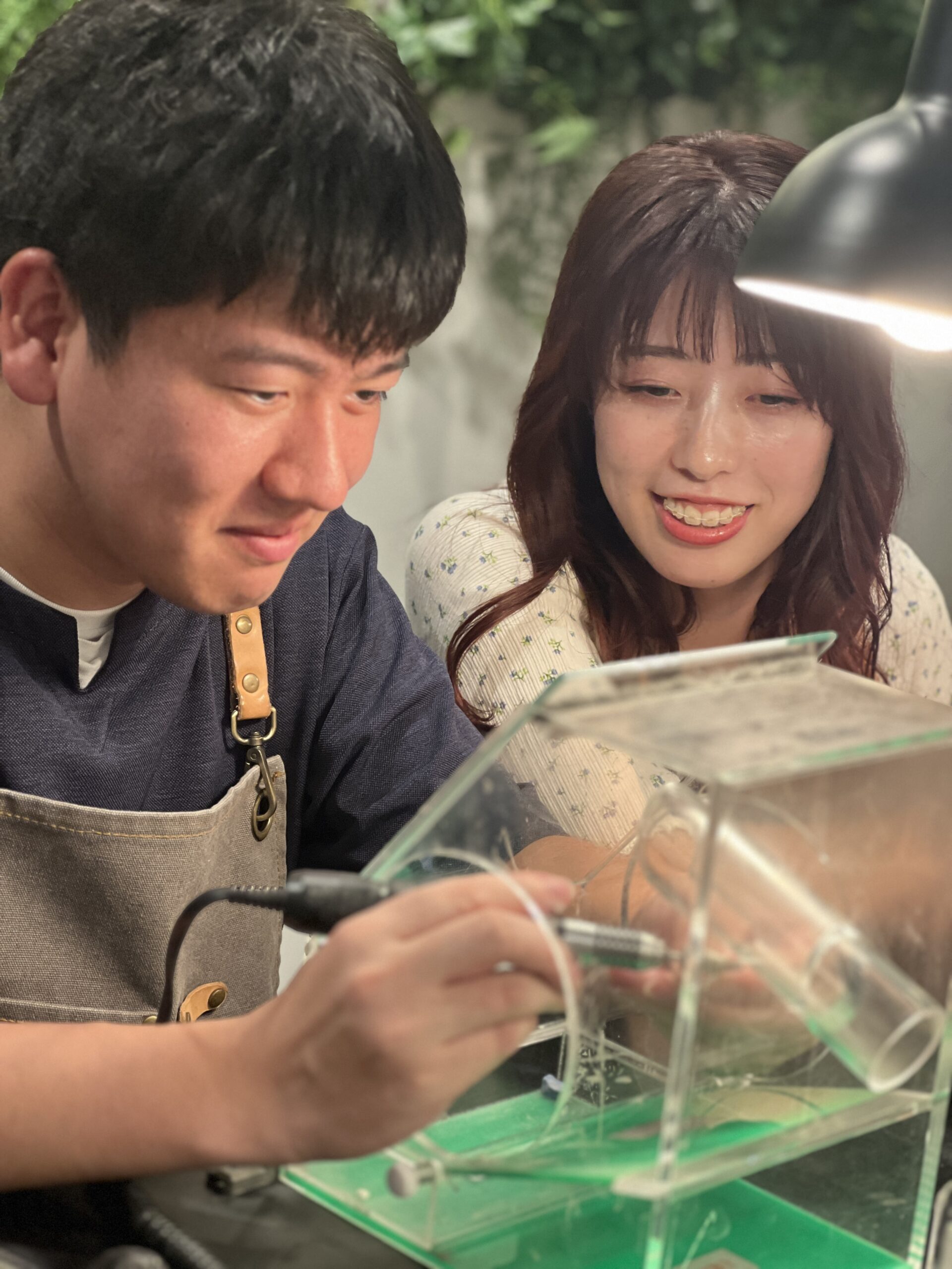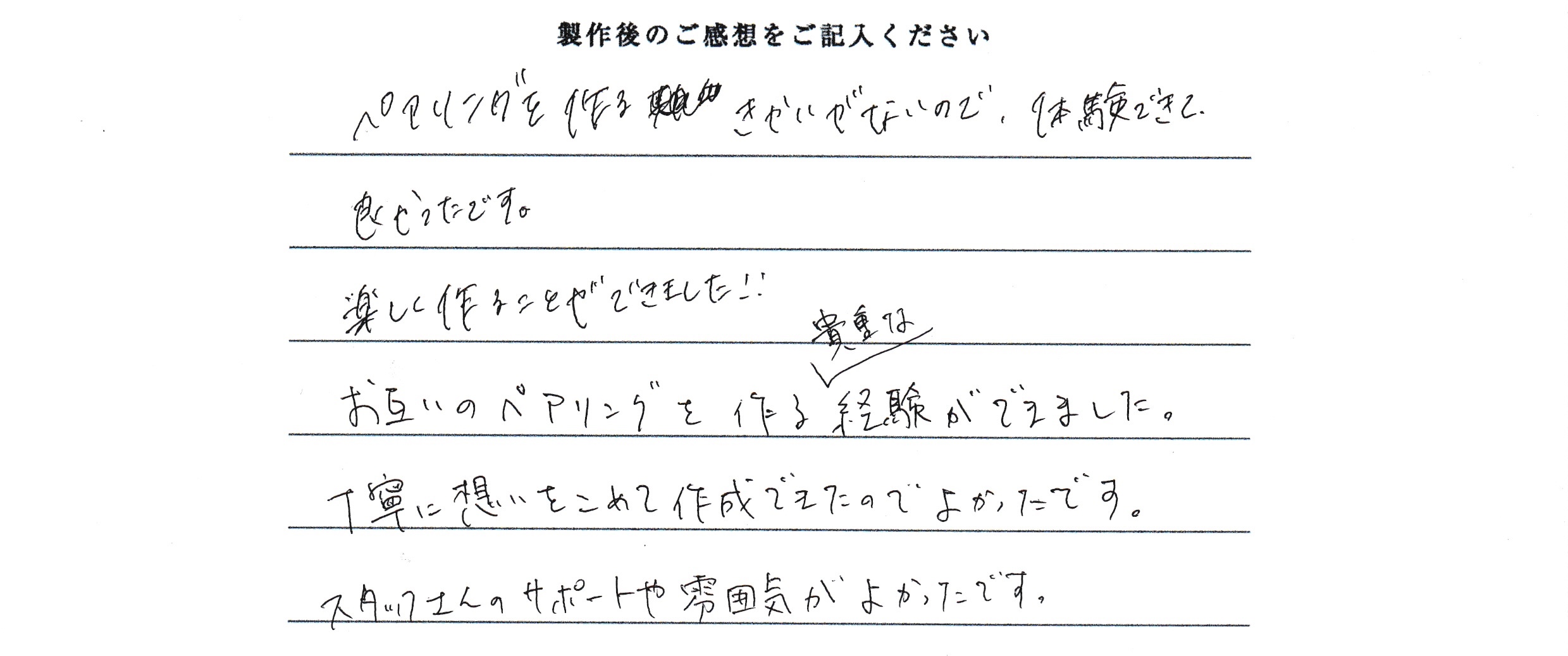 お互いのペアリングを作る貴重な経験ができました。丁寧に想いをこめて作成できたのでよかったです。スタッフさんのサポートや雰囲気がよかったです。
