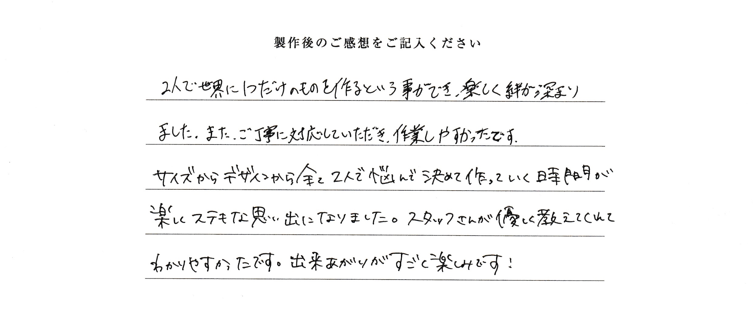 2人で世界に1つだけのものを作るという事ができ、楽しく絆が深まりました。またご丁寧に対応していただき、作業がしやすかったです。サイズからデザインからすべて2人で悩んで決めて作っていく時間が、楽しくステキな思い出になりました。スタッフさんが優しく教えてくれてわかりやすかったです。出来あがりが、すごく楽しみです!