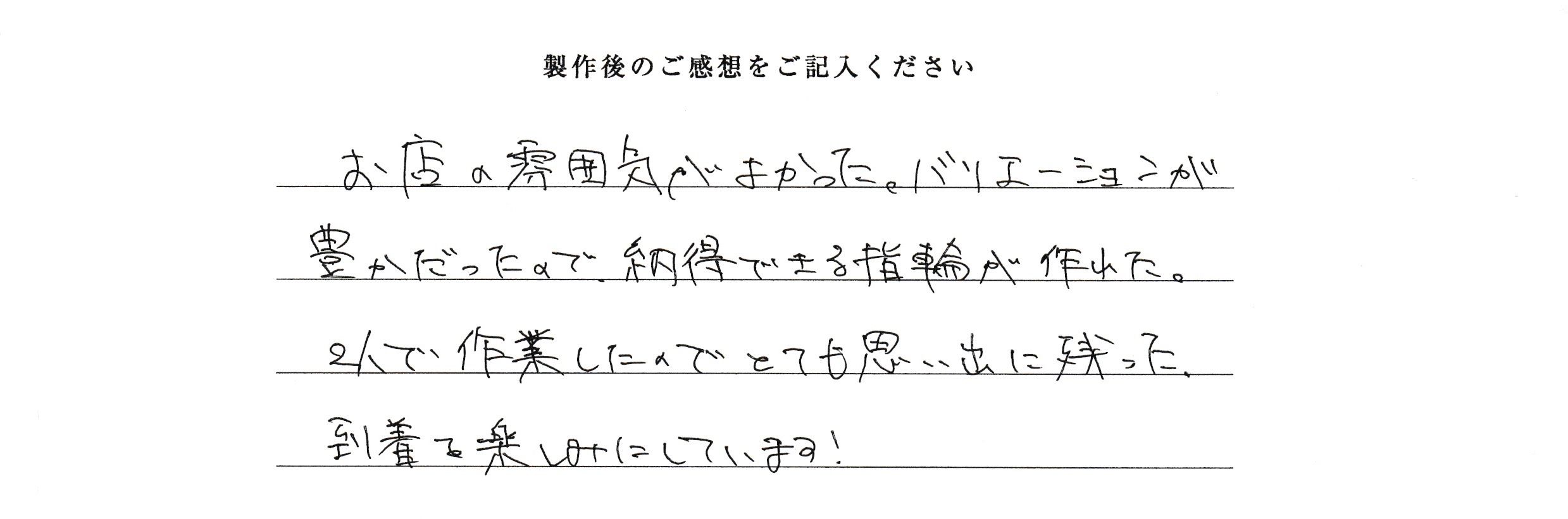 お店の雰囲気がよかった。バリエーションが豊かだったので、納得できる指輪が作れた。2人で作業したので、とても思い出に残った。到着を楽しみにしています!