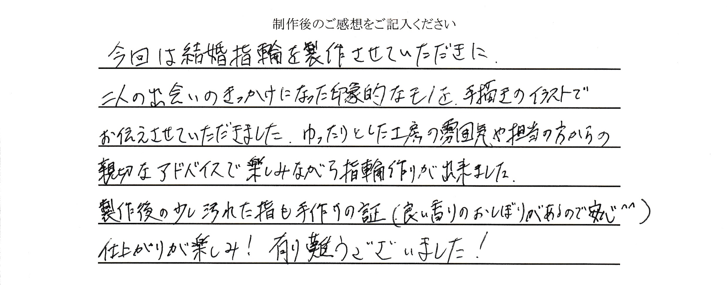 今回は結婚指輪を製作させていただきに、二人の出会いのきっかけになった印象的なモノを、手描きのイラストでお伝えさせていただきました。ゆったりとした工房の雰囲気や担当の方からの親切なアドバイスで楽しみながら指輪作りが出来ました。製作後の少し汚れた指も手作りの証(良い香りのおしぼりがあるので安心^^)仕上がりが楽しみ!有り難うございました!