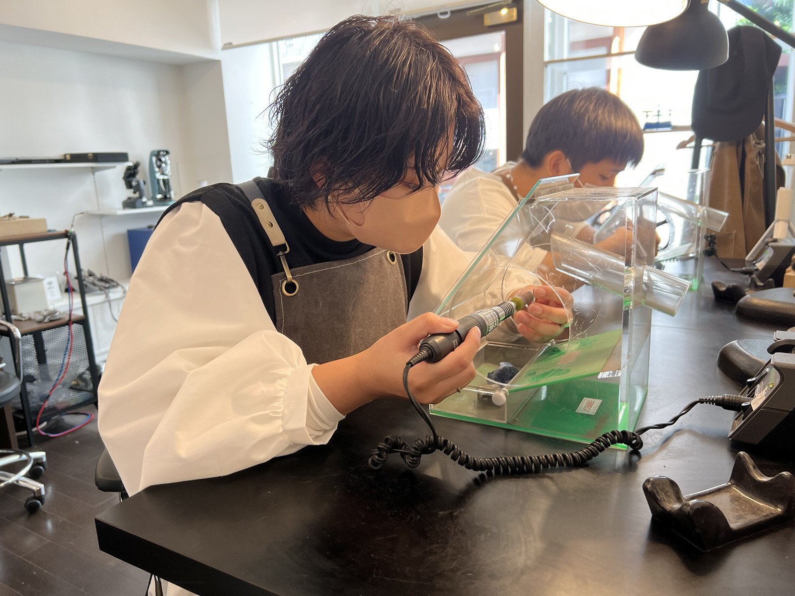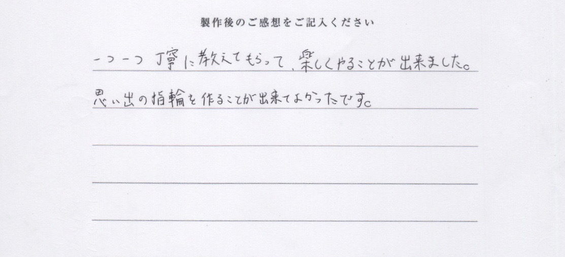 ペアリング制作過程も真剣に楽しく最後まで頑張って頂きました!お二人でじっくり考えた刻印内容と文字のバランスもとても個性的でかっこいいリングに仕上がりました。