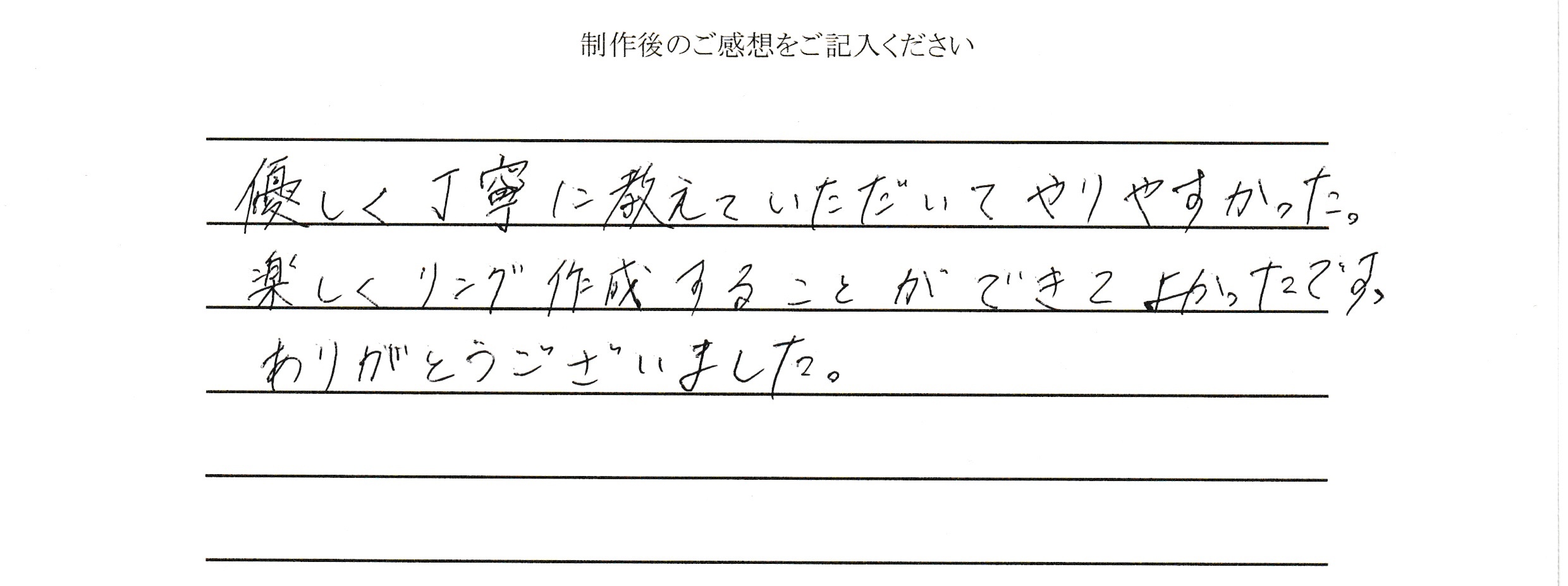 優しく丁寧に教えていただいてやりやすかった。楽しくリング作成することができてよかったです。ありがとうございました。