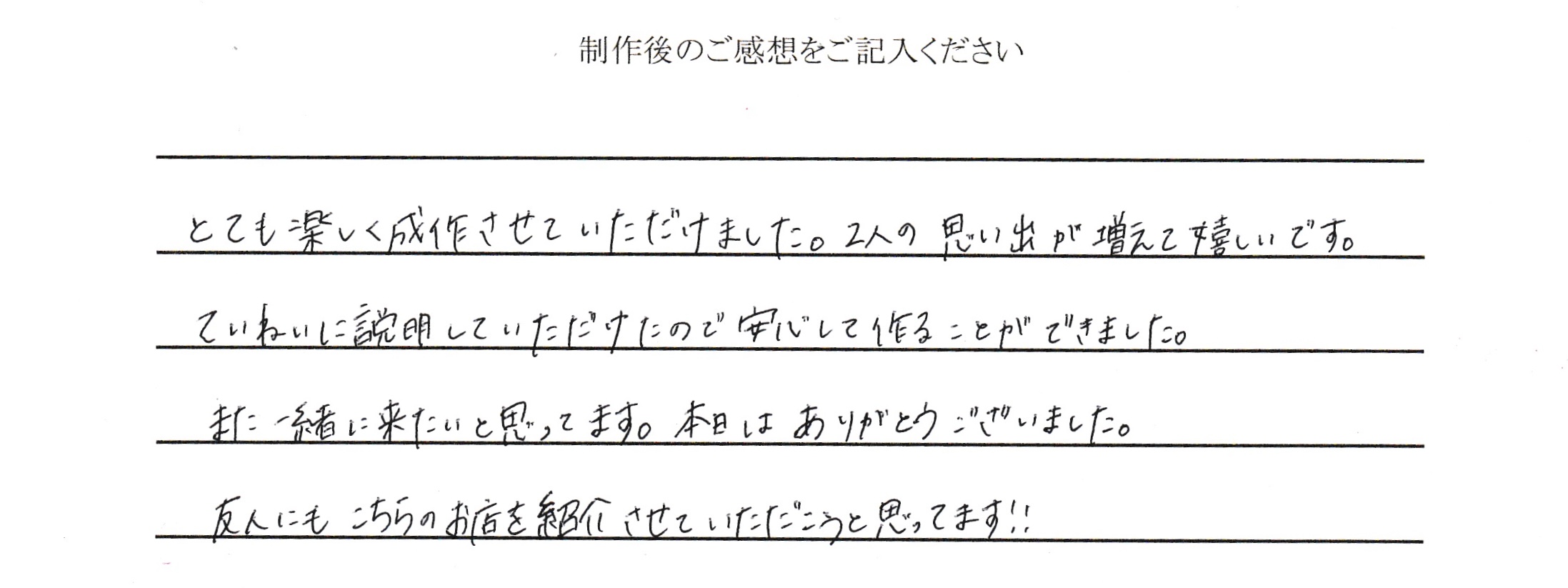 Archiveアーカイブ Home > お客様の声 > 手作りペアリング > 2人の思い出が増えて嬉しいです > IMG_9295 IMG_9295 トップへ戻る Access アクセス Reserve ご予約