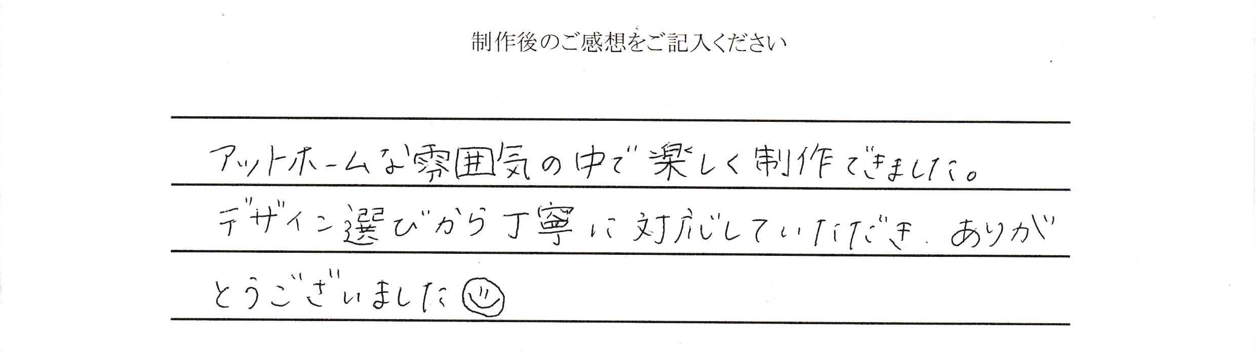 Archiveアーカイブ Home > お客様の声 > 手作りペアリング > アットホームな雰囲気の中で楽しく制作できました > IMG_9461 2 IMG_9461 2 トップへ戻る Access アクセス Reserve ご予約
