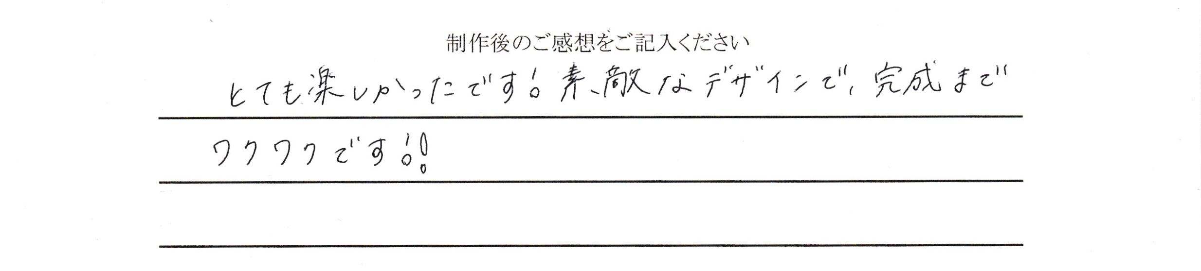 Archiveアーカイブ Home > お客様の声 > 手作りペアリング > 素敵なデザインで完成までワクワクです!! > IMG_1747 IMG_1747 トップへ戻る Access アクセス Reserve ご予約